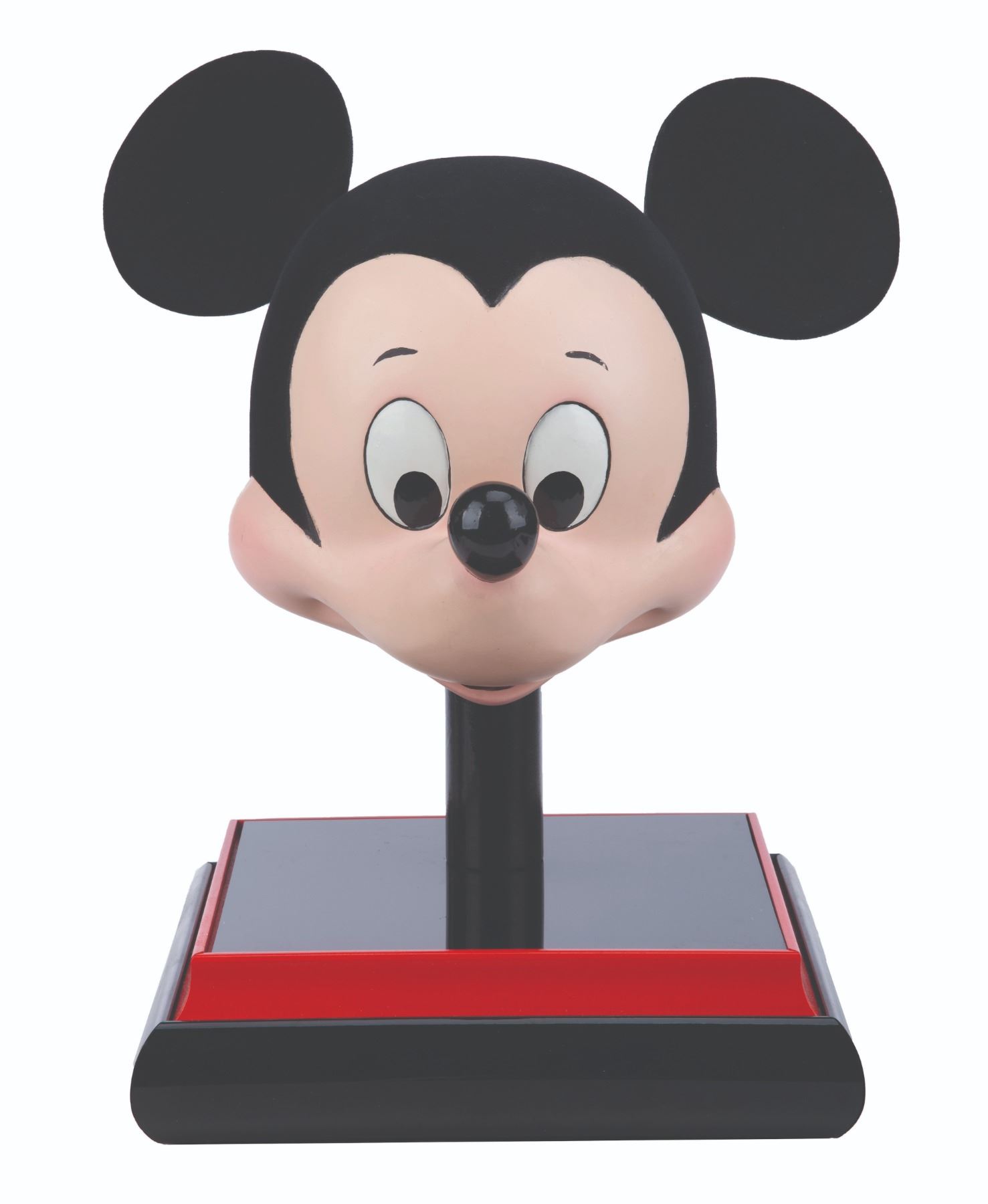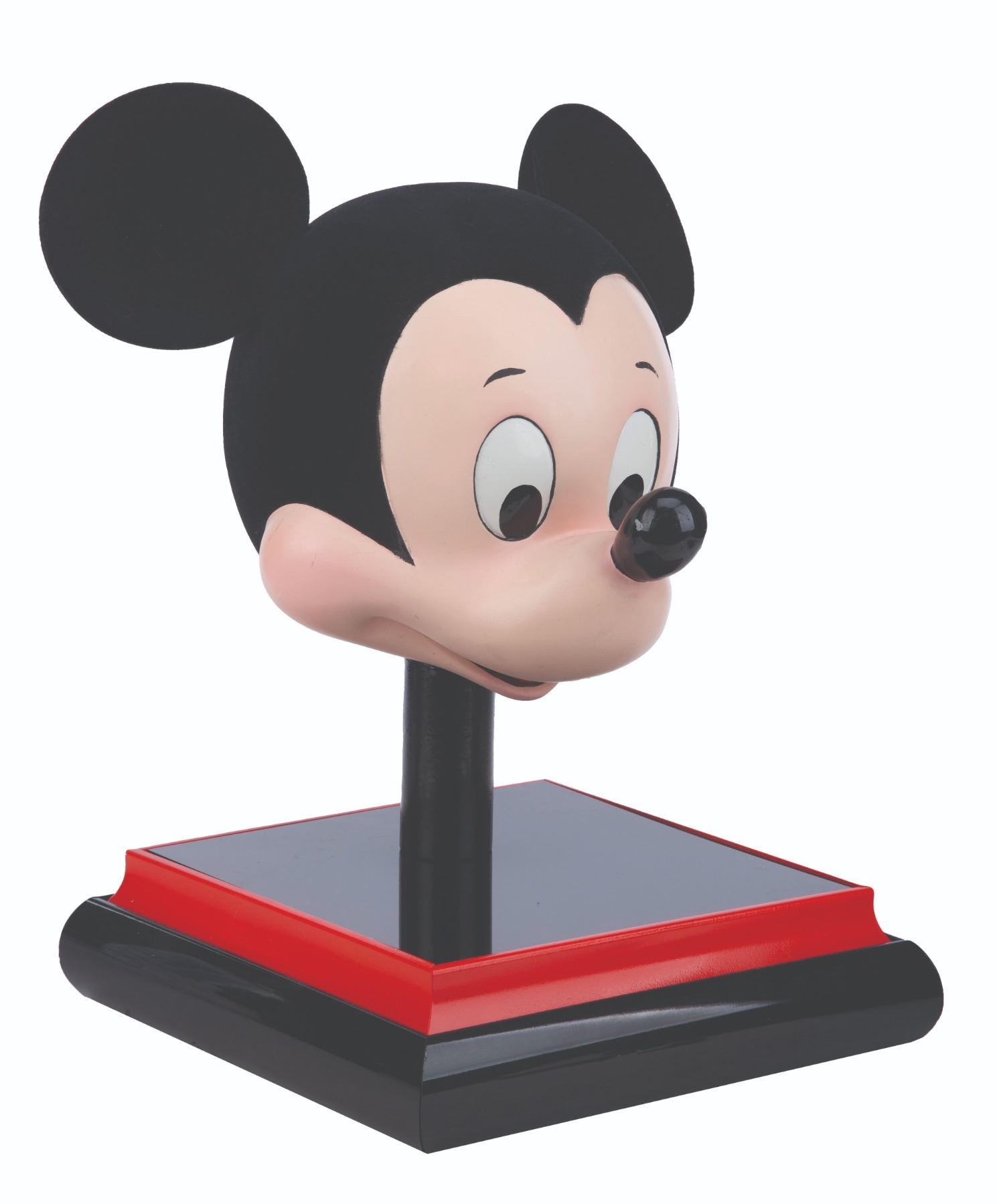 (Disneyland, 1990s) An Emporium Shop Display Mickey Mouse Head. The figural head is hand-painted and flocked and was created for an interior display of the popular merchandise location. Measuring 14.5"x14.5" atop a custom 11.75"x11.75" and 3.5" deep base, the head is in very good condition with minor spots of discoloration to the flocking, mild scuffs and scratches and wear from Park use and age.