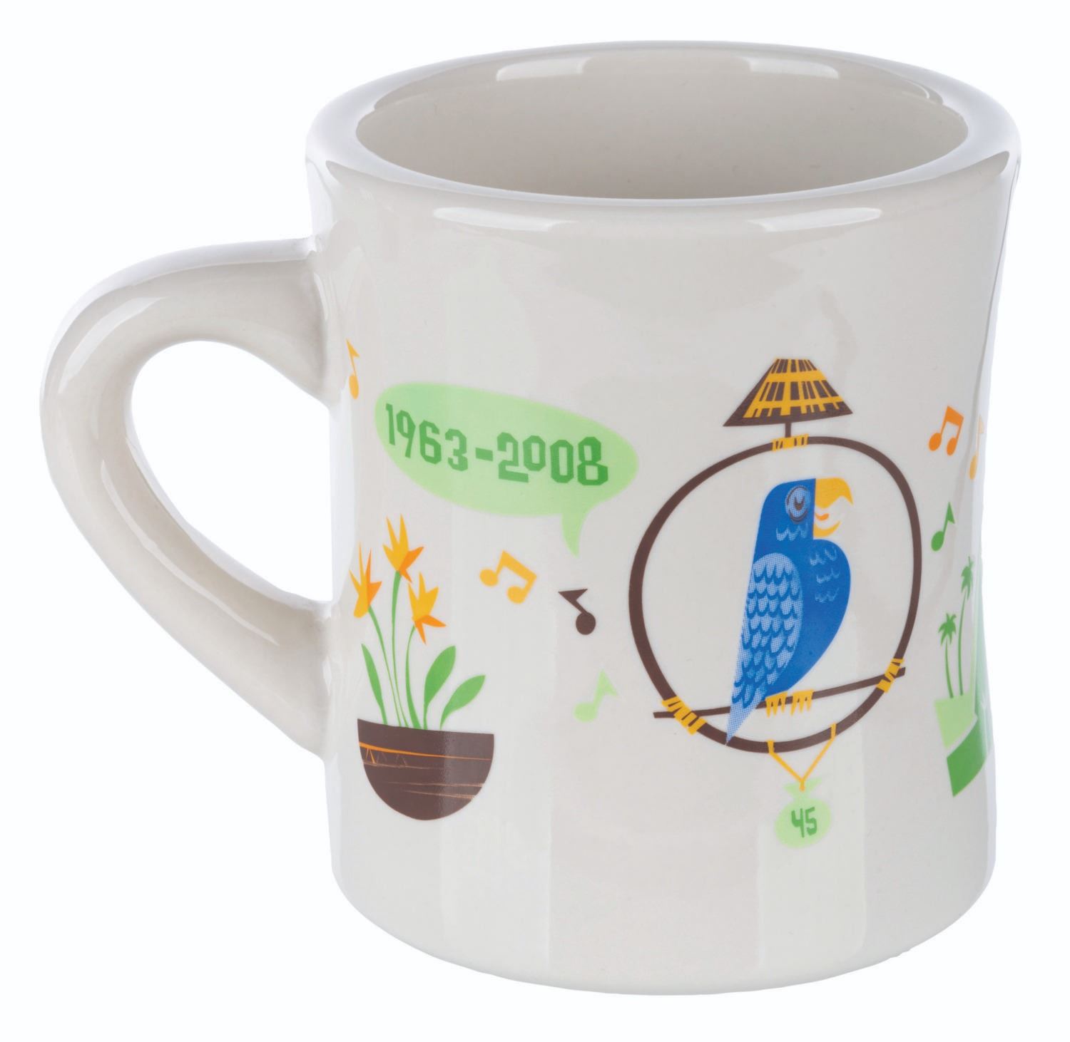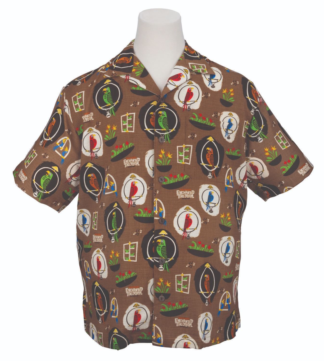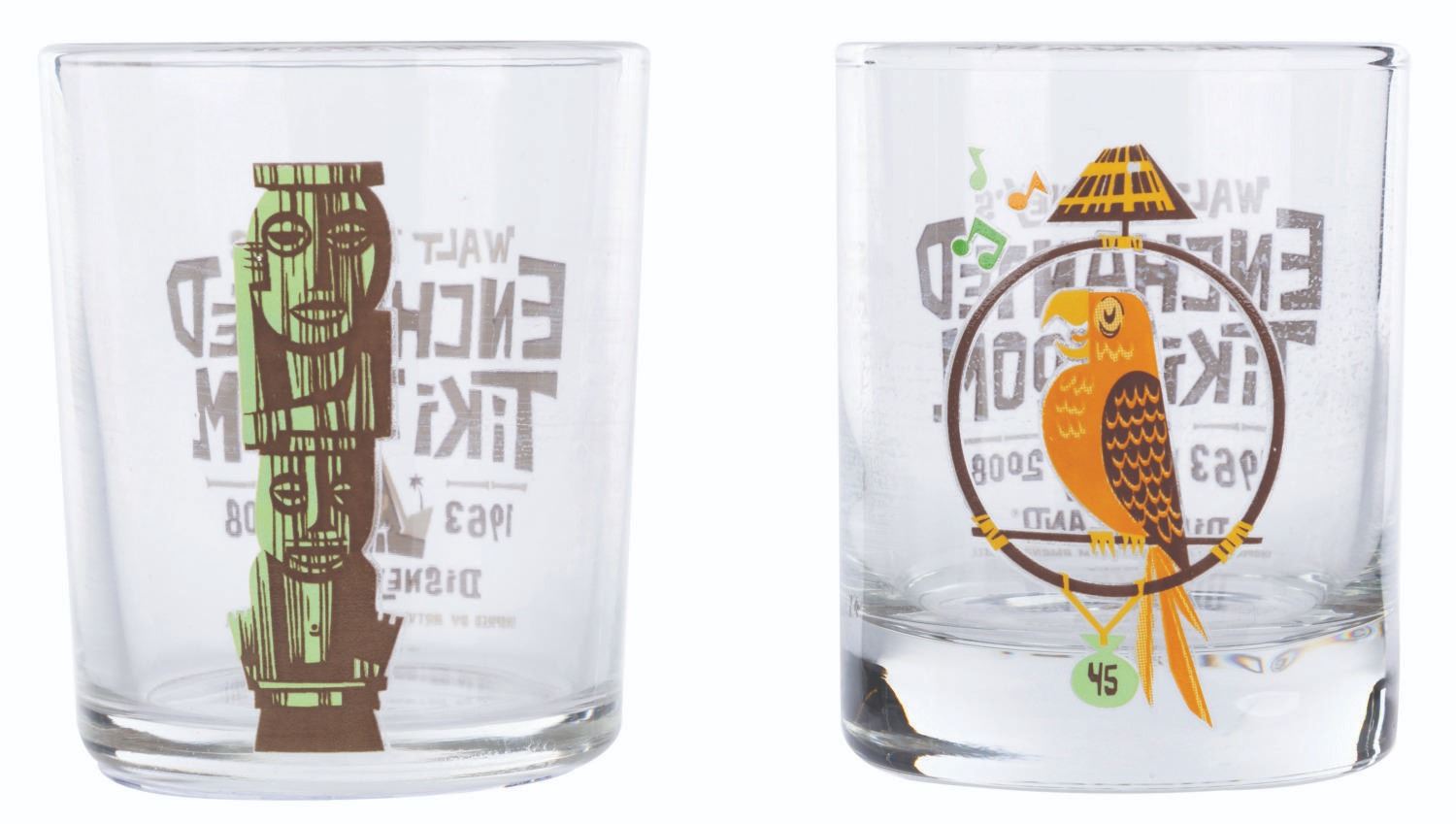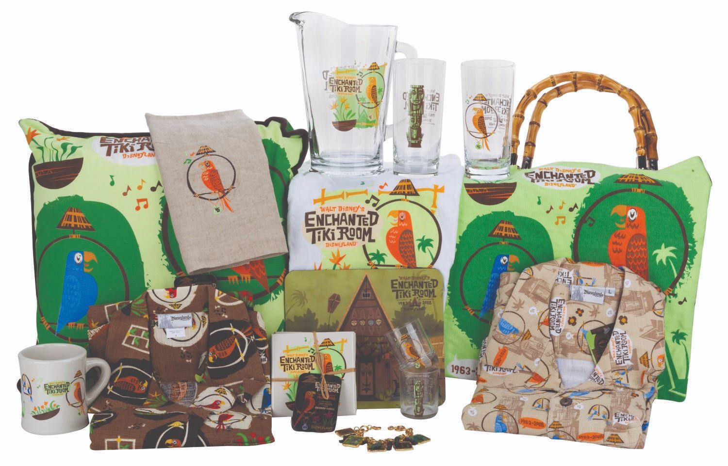(Disneyland, 2008) A collection of fifteen souvenirs from the 45th anniversary of Walt Disney’s Enchanted Tiki Room, inspired by art from Amanda Visell. Included are a pitcher, two shot glasses, two glasses, a mug, a pillow, a mousepad, a dish towel, a four coaster set, a bag, a T-shirt, two button-up shirts, and a boxed charm bracelet. Ranging in size from the 2” x 2.5” tall shot glasses to the 16.5” x 16.5” pillow and with shirts all size L, the items are in good to fine condition with light scuffs, folds from storage, stains on the T-shirt, chips on the pitcher, and light pilling on the towel. This lot will require special shipping arrangements. Please inquire before bidding.