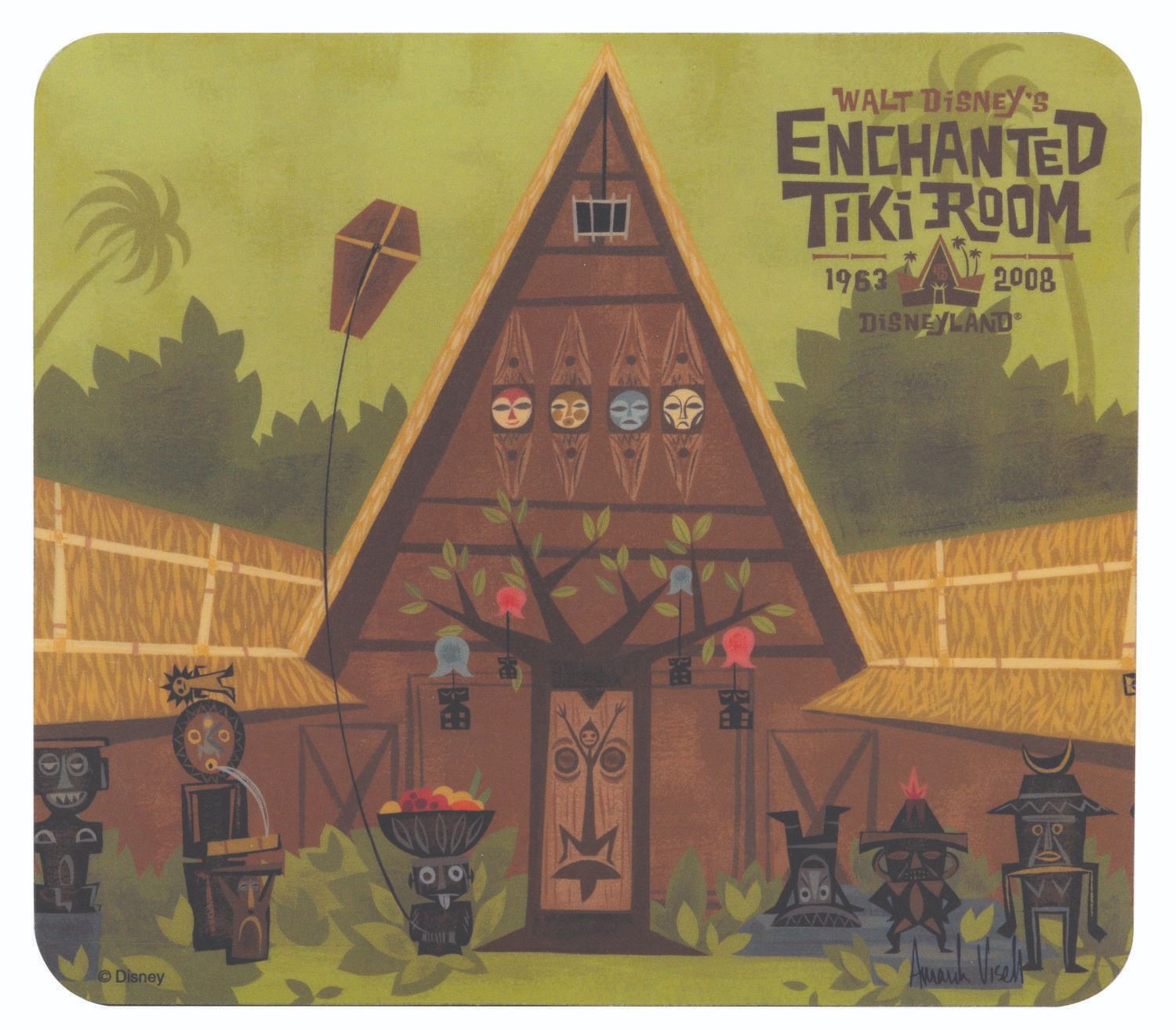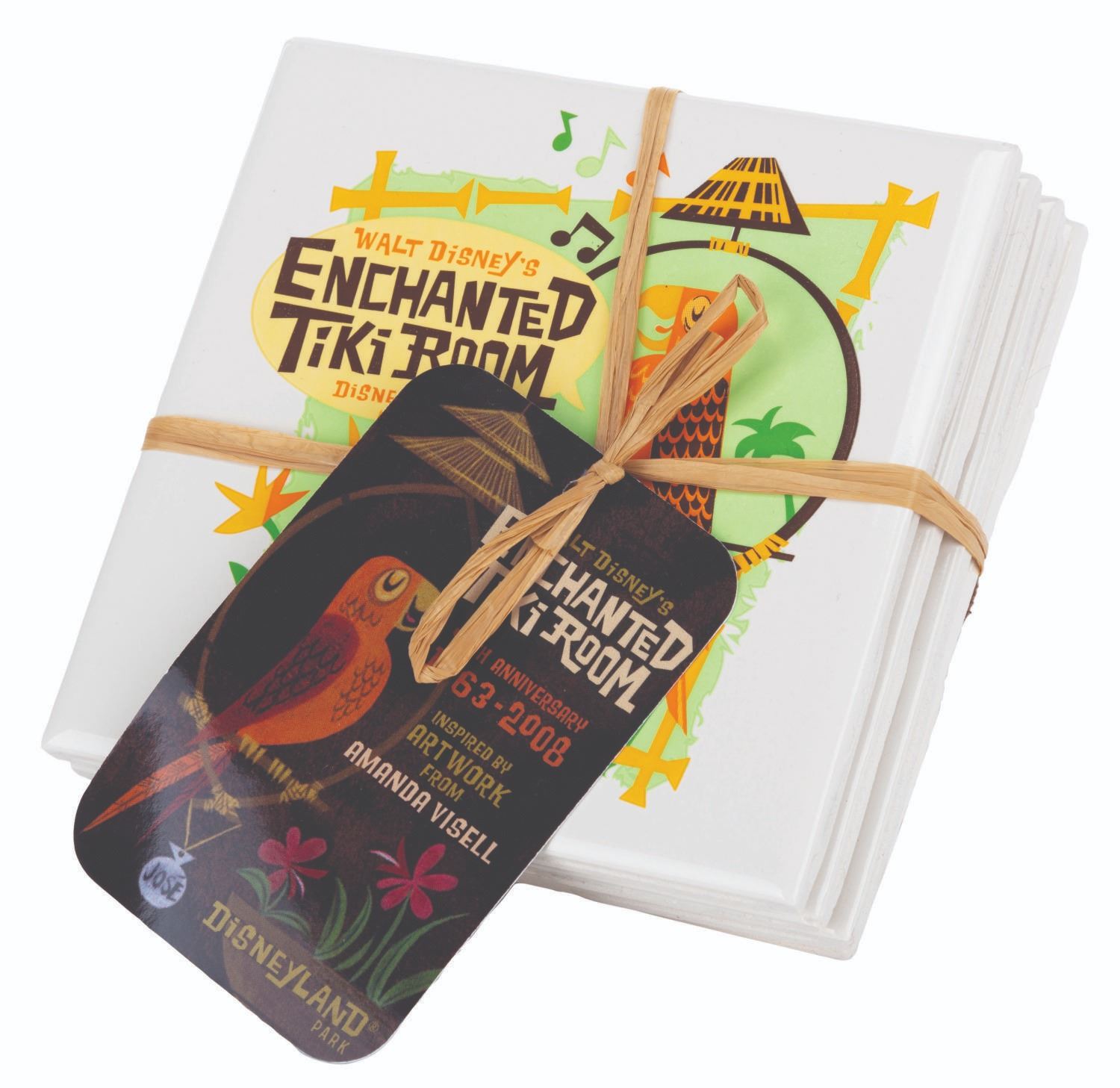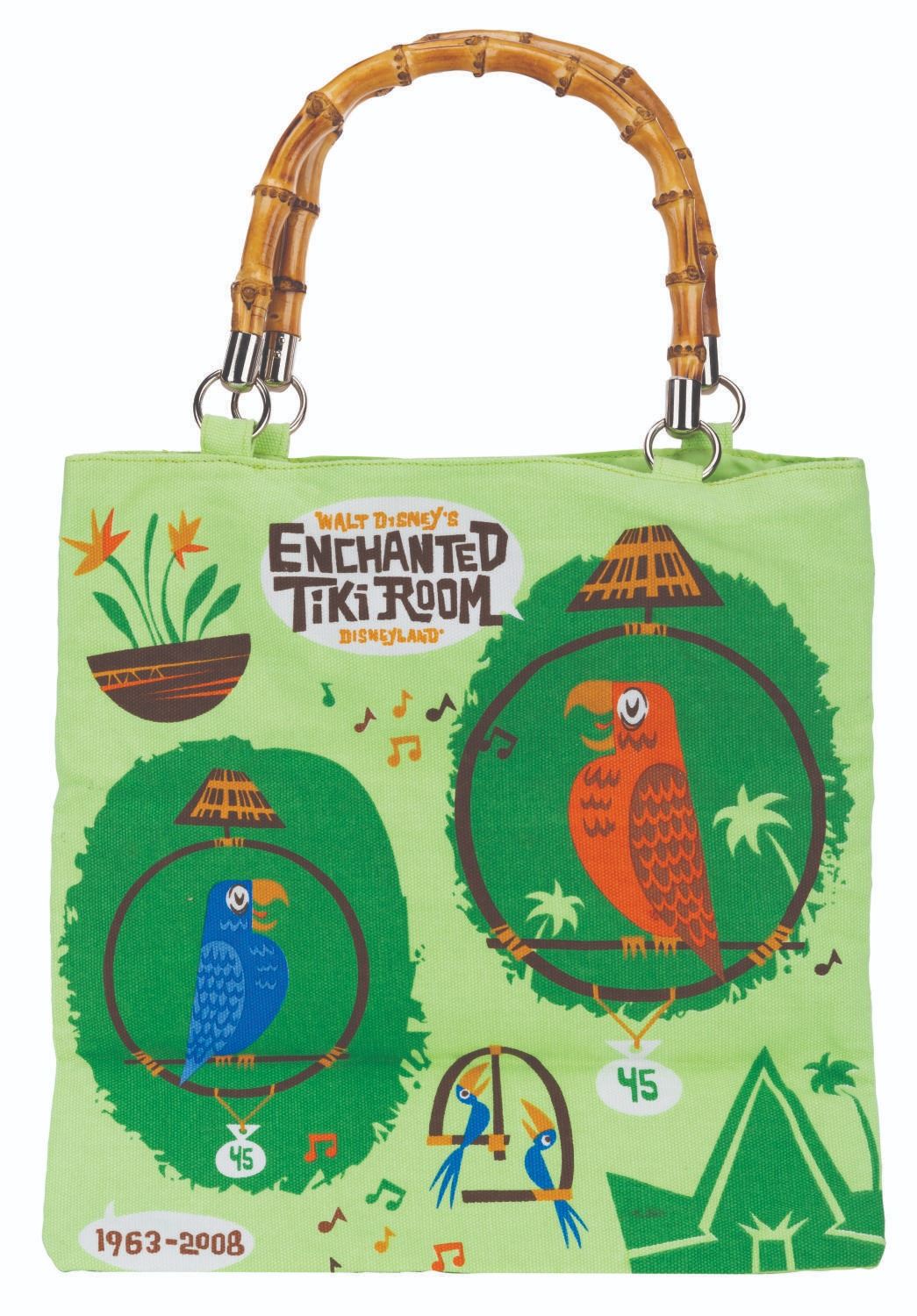 (Disneyland, 2008) A collection of fifteen souvenirs from the 45th anniversary of Walt Disney’s Enchanted Tiki Room, inspired by art from Amanda Visell. Included are a pitcher, two shot glasses, two glasses, a mug, a pillow, a mousepad, a dish towel, a four coaster set, a bag, a T-shirt, two button-up shirts, and a boxed charm bracelet. Ranging in size from the 2” x 2.5” tall shot glasses to the 16.5” x 16.5” pillow and with shirts all size L, the items are in good to fine condition with light scuffs, folds from storage, stains on the T-shirt, chips on the pitcher, and light pilling on the towel. This lot will require special shipping arrangements. Please inquire before bidding.