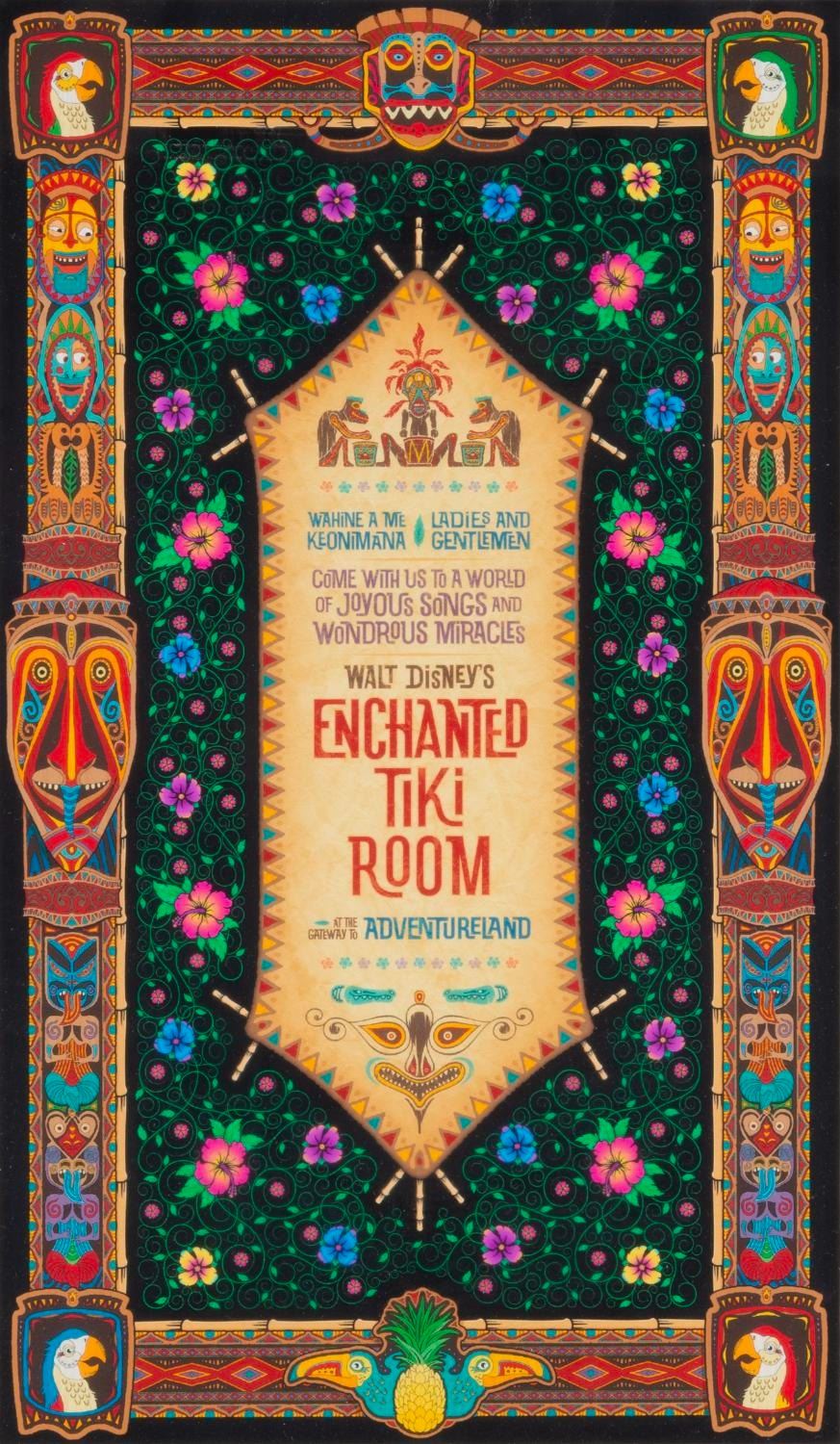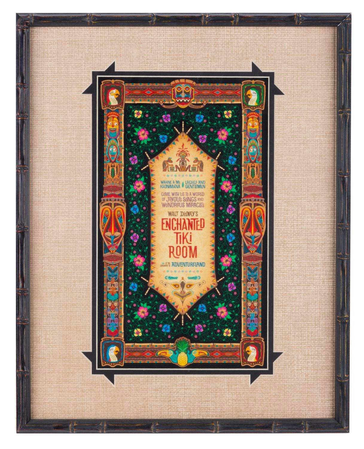 (Disney, 2013) A framed Enchanted Tiki Room print by Disney artist Jeremy Fulton, released for the 50th anniversary of the attraction. With a viewable image of 7.75” x 13.25” in a 14” x 18” matte and a 15” x 19” bamboo-themed frame, the print displays in fine condition.
