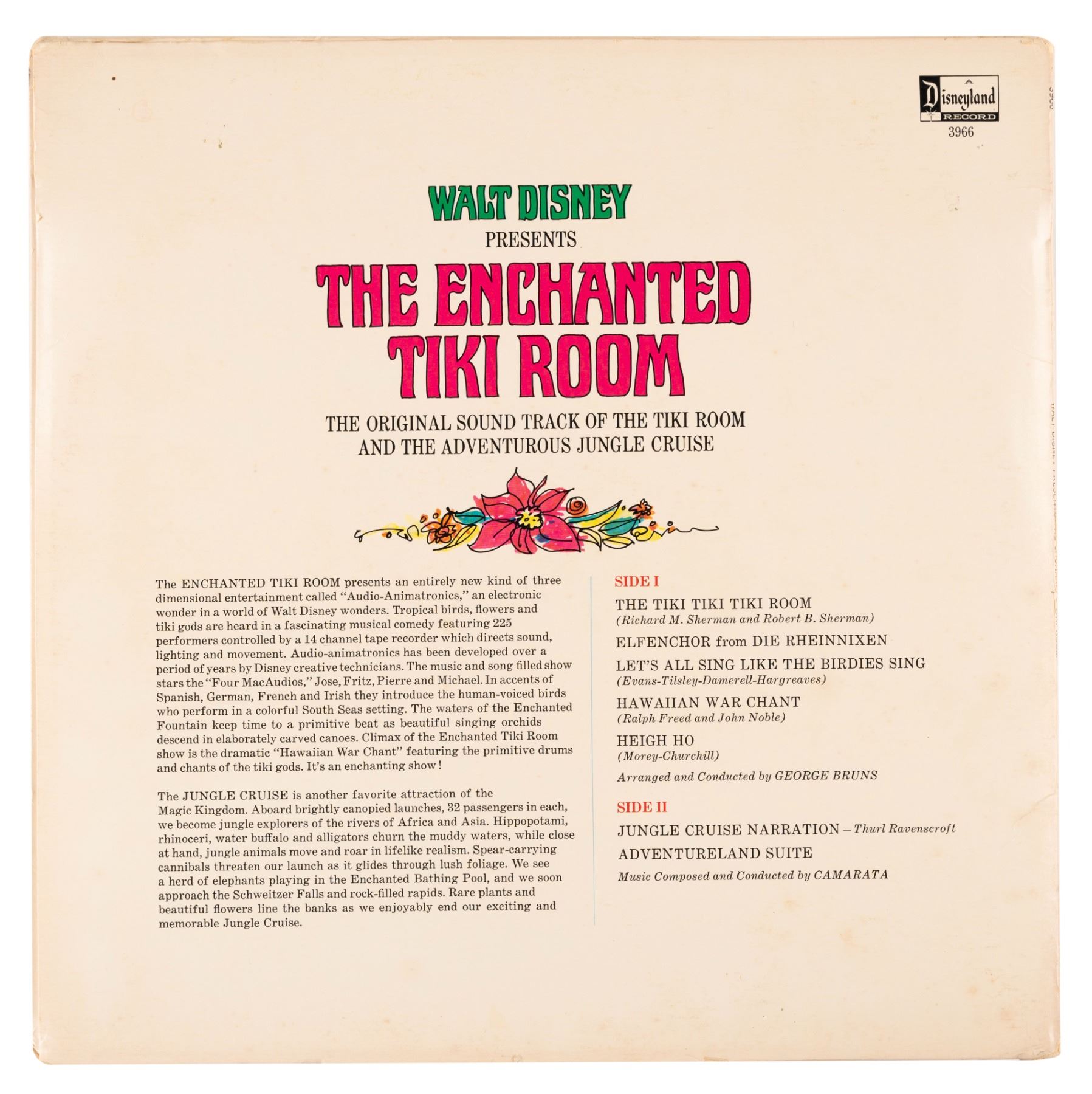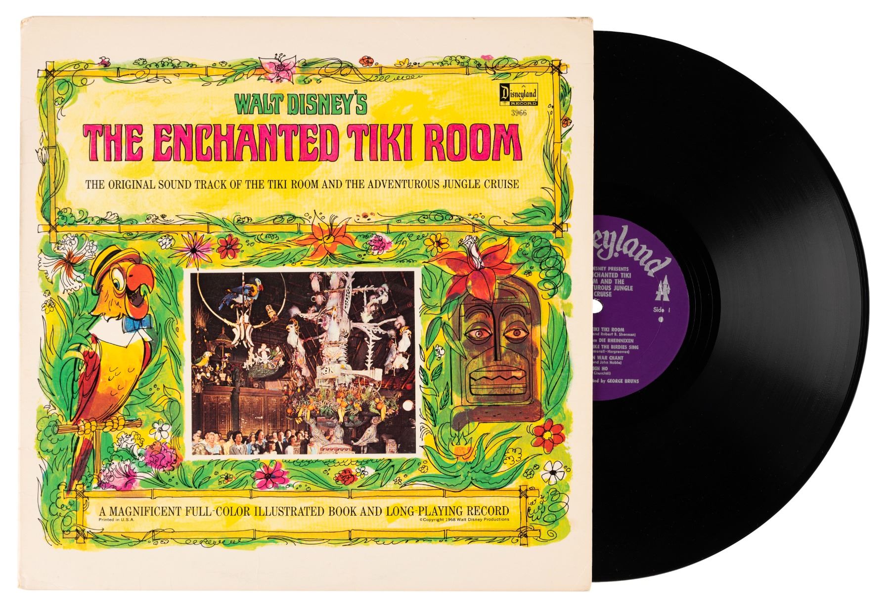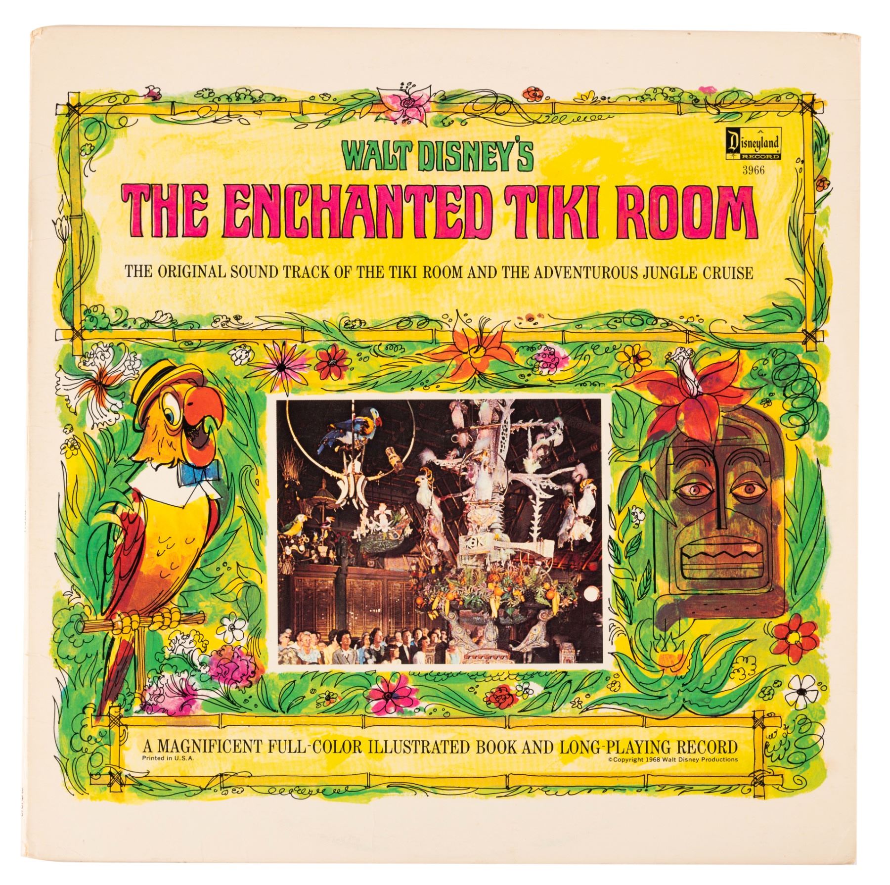 (Disneyland, 1968) A beautifully illustrated book and record set featuring a story and songs from the "Enchanted Tiki Room," with additional songs from the "Jungle Cruise." The 11-page book and record measures 12.5" x 12.5" with the cover in good condition with typical wear overall, and the record in fine condition appearing unplayed.