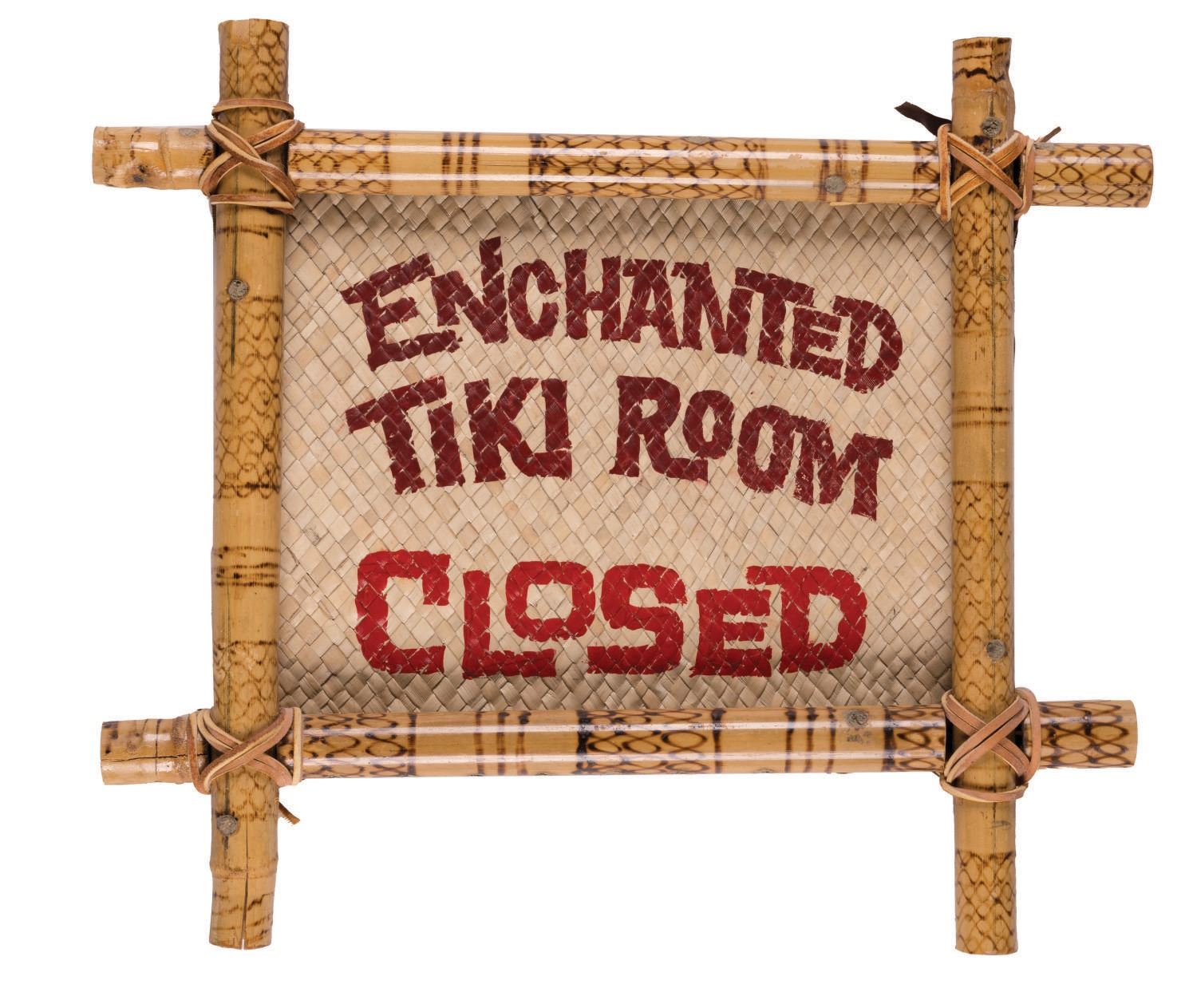 (Disneyland, 1990s) A Walt Disney’s Enchanted Tiki Room Closed sign. The small sign with a south-seas flair is constructed of a hand-painted straw mat with a leather cord-bound, wood-burned bamboo frame and was displayed in the area during closure of the attraction. Measuring 15”x13”, the sign is in very good condition with wear from Park display.