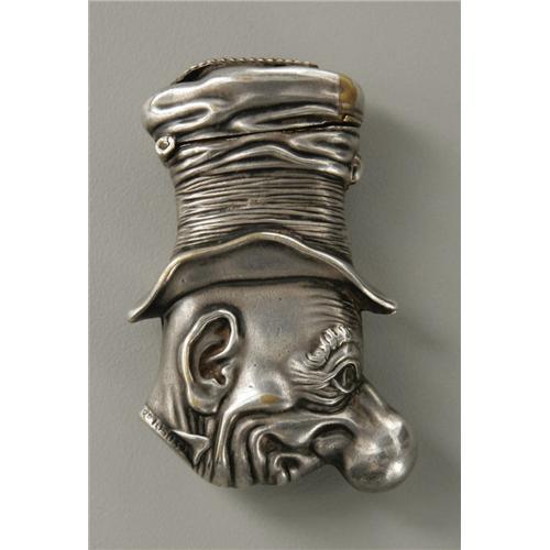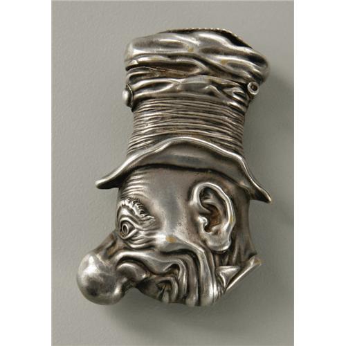<B>An English Match Safe</B></I><BR>Maker unknown<BR><BR>The drunkard match safe with striking surface to the top of the hinged lid, with release button, numbered to collar <I>RD105032</B></I><BR>2.25in. long<BR>1 Items <BR><BR><B>Condition Report:</B> Normal signs of wear with age