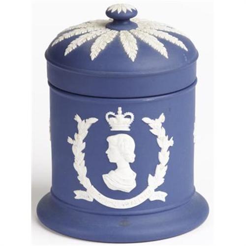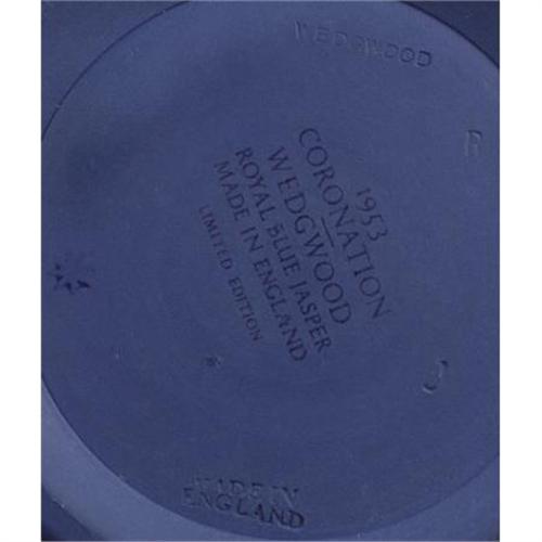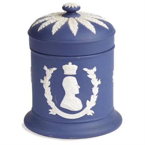 <B>An English Porcelain Box<BR></B></I>Wedgwood<BR>1953<BR>The royal blue jasper box with applied white reliefs of Queen Elizabeth II and Prince Philip, the Duke of Edinburgh, a limited edition commemorating the royal coronation<BR>Marked underside<BR>4 inches high<BR><BR><b>Shipping:</b> Requires 3rd Party Shipping (<a target="_blank" href="http://www.heritageauctions.com/common/shipping.php">view shipping information</a>)
