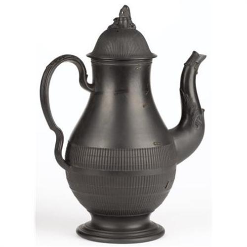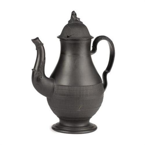 <B>An English Porcelain Coffeepot<BR></B></I>Wedgwood<BR>Nineteenth Century<BR>12 inches high<BR>Impressed mark to the underside<BR><BR>In black basalt, ribbed lower body with leaf decoration to the spout and lid knop.<BR><BR><b>Shipping:</b> Requires 3rd Party Shipping (<a target="_blank" href="http://www.heritageauctions.com/common/shipping.php">view shipping information</a>)