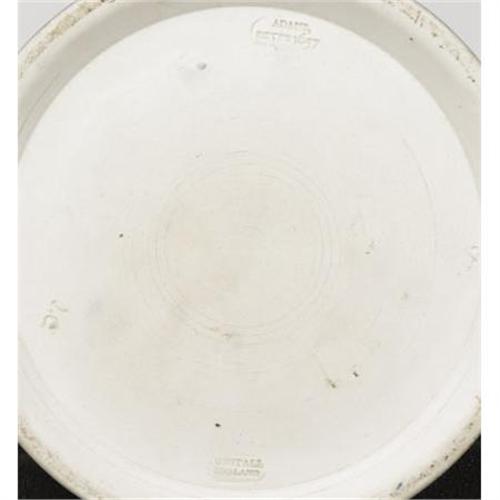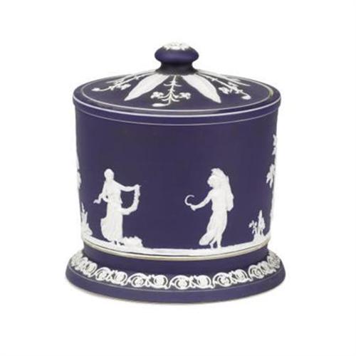 <B>An English Porcelain Covered Jar<BR></B></I>Tunstall<BR>Circa 1900<BR>The blue Adamsware jar decorated with classical scenes in white relief<BR>Marked underside<BR>6-1/2 inches high x 5-1/4 inch diameter<BR><BR><BR><b>Shipping:</b> Requires 3rd Party Shipping (<a target="_blank" href="http://www.heritageauctions.com/common/shipping.php">view shipping information</a>)