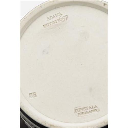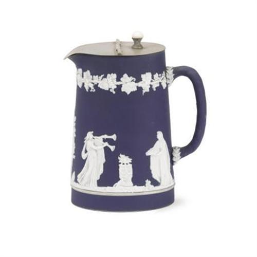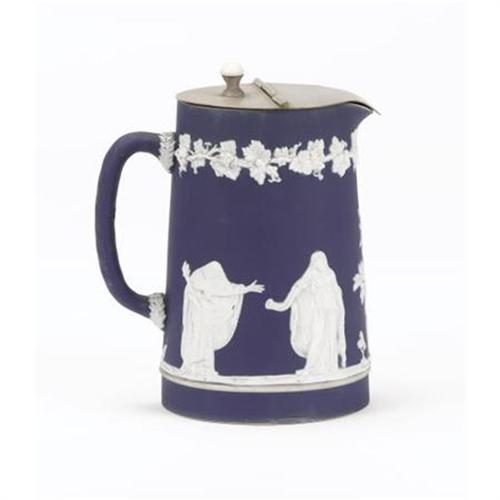 <B>An English Porcelain Pitcher<BR></B></I>Tunstall<BR>Nineteenth Century<BR>6 inches high x 3-1/2 inch diameter<BR>Marked underside<BR><BR>The blue Adamsware pitcher decorated with classical scenes in white relief, hinged metal lid.<BR><BR><b>Shipping:</b> Requires 3rd Party Shipping (<a target="_blank" href="http://www.heritageauctions.com/common/shipping.php">view shipping information</a>)