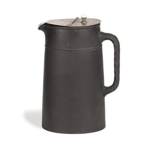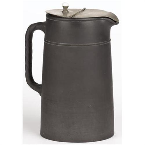 <B>An English Porcelain Pitcher<BR></B></I>Wedgwood<BR>Nineteenth Century<BR>In black basalt plain body pitcher with a silver lid<BR>Impressed mark to the underside<BR>7.5 inches high x 5.5 inches wide<BR><BR><b>Shipping:</b> Requires 3rd Party Shipping (<a target="_blank" href="http://www.heritageauctions.com/common/shipping.php">view shipping information</a>)