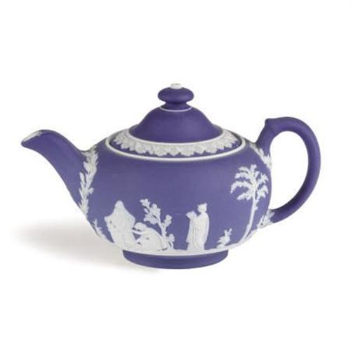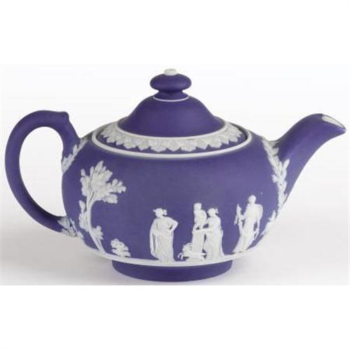 <B>An English Porcelain Teapot</B></I><BR>Wedgwood<BR>Circa 1900<BR>The blue Jasperware teapot decorated with classical scenes in white relief<BR>Impressed mark to the underside<BR>4.2 inches high x 6.7 inches wide x 4.2 inches deep<BR><BR><b>Shipping:</b> Requires 3rd Party Shipping (<a target="_blank" href="http://www.heritageauctions.com/common/shipping.php">view shipping information</a>)