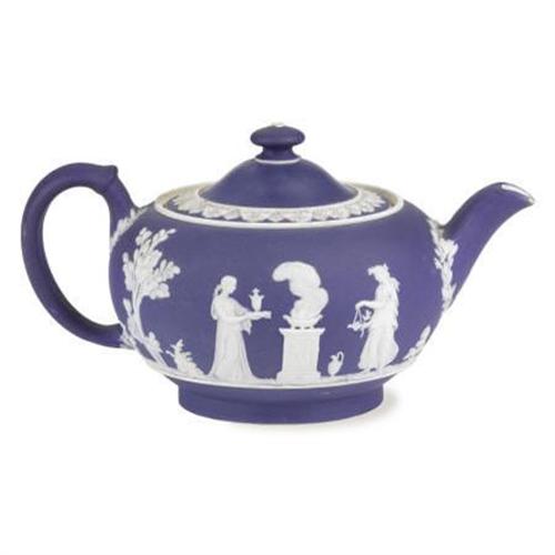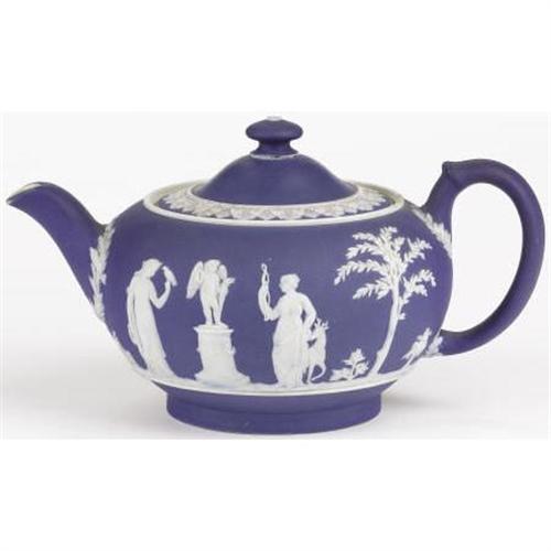 <B>An English Porcelain Teapot<BR></B></I>Wedgwood<BR>Circa 1900<BR>The blue jasperware teapot with classical scenes in white relief<BR>Impressed mark to the underside<BR>5 inches high x 8.5 inches wide x 5.5 inches deep<BR><BR><b>Shipping:</b> Requires 3rd Party Shipping (<a target="_blank" href="http://www.heritageauctions.com/common/shipping.php">view shipping information</a>)