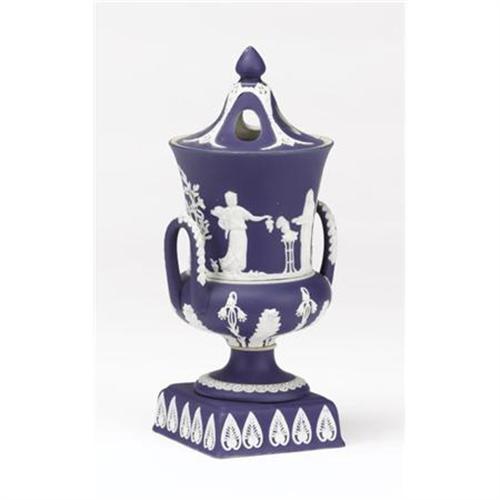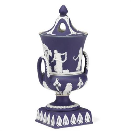 <B>An English Porcelain Vase<BR></B></I>Tunstall<BR>Nineteenth Century<BR>8-3/4 inches high x 4-1/4 inches wide<BR>Impressed mark to the underside<BR><BR>The blue Adamsware vase decorated with mythological scenes with white relief.<BR><BR><BR><b>Shipping:</b> Requires 3rd Party Shipping (<a target="_blank" href="http://www.heritageauctions.com/common/shipping.php">view shipping information</a>)