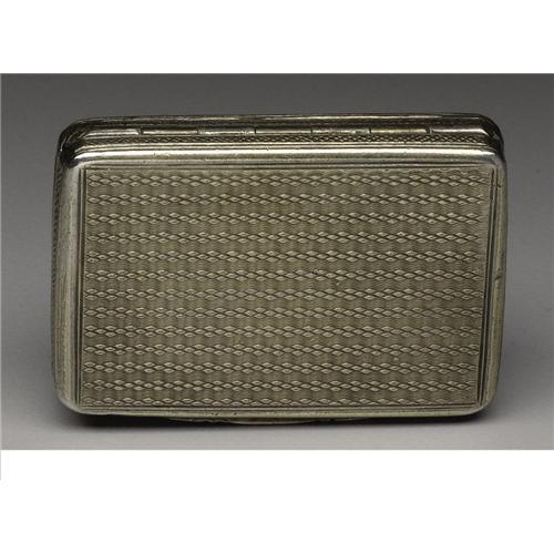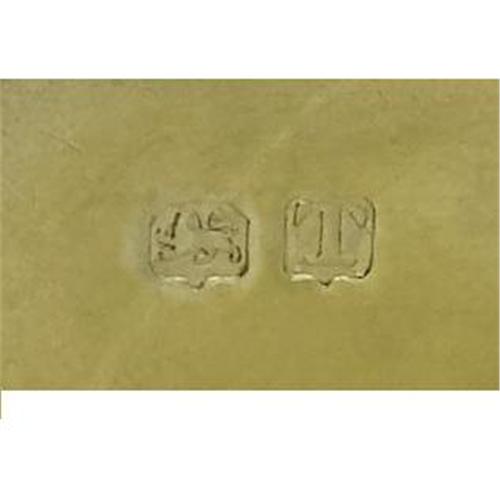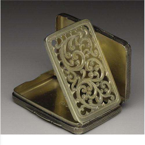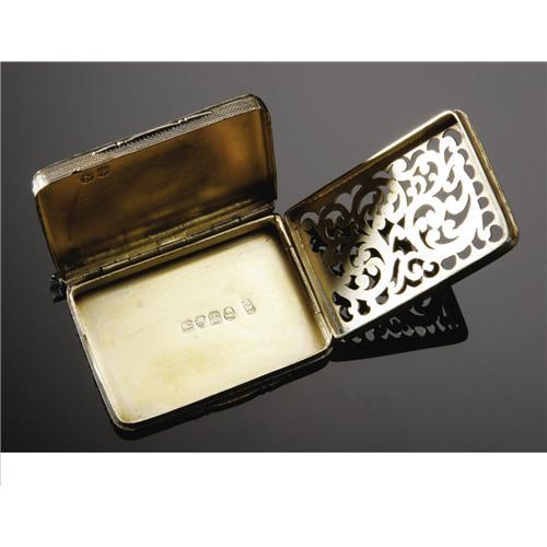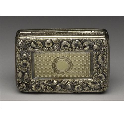 <B>A George III Silver Gilt Vinaigrette</B></I><BR><BR>William Eaton, London, England<BR>1814-15<BR>Silver gilt<BR>Marks: (lion passant), (leopard's head), (monarch profile), <I>WE, T</B></I><BR>1.8 in. long, 1.3 troy ounces<BR><BR>With engine turned ground, the top with embossed floral border and circular reserve; pierced scroll grill.
