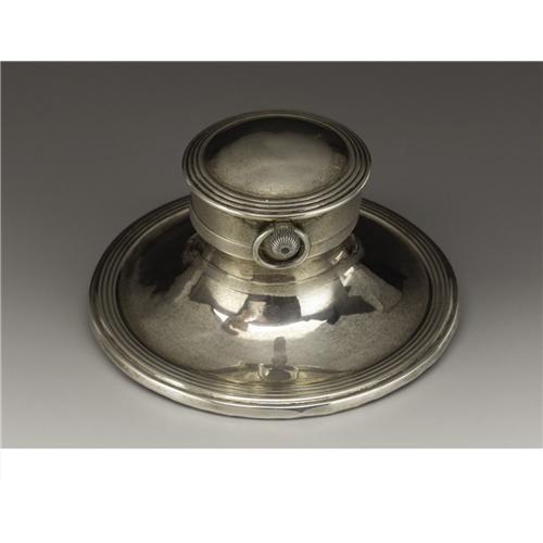 <B>An English Silver Inkwell with Clock</B></I><BR><BR>William Comyns, London, England<BR>1909-10<BR>Silver, porcelain<BR>Marks: (lion passant), (leopard's head), <I>WC, o, A185</B></I><BR>2.62 in. high x 5 in. diameter<BR><BR>With flared silver base, the covered reservoir inset with porcelain well, a pocket watch contained within lid.