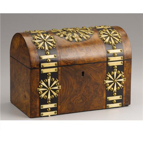 <B>An English Victorian Burl Wood Tea Caddy</B></I><BR><BR>English<BR>Nineteenth Century<BR>Burled wood, ebonized wood, bone and brass hob nails<BR>9 in. long<BR><BR>The rectangular form with domed hinged cover, two ebonized strips and a medallion applied with bone star patterns and brass hob nails, opening to a silk lined, two compartment interior<BR>1 Items <BR><BR><B>Condition Report:</B> Normal signs of wear as appropriate with age, later interior covers