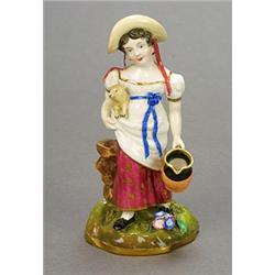 An English bone china model of a shepherdess, possibly Minton, modelled standing, holding a lamb under one arm, a pitcher in her other hand, on a gilt-line mound base, painted with coloured enamels, 13.5cm high, circa 1830 (see illustration) £400-500