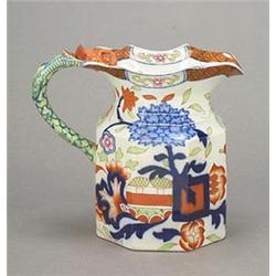 An English ironstone octagonal jug, of Fenton-type shape with moulded dragon's head upper terminal to the handle, decorated with a typical Japan pattern, height 16.1cm, unmarked except for red-painted pattern number 7322, circa 1825-50 (see illustration) £70-100