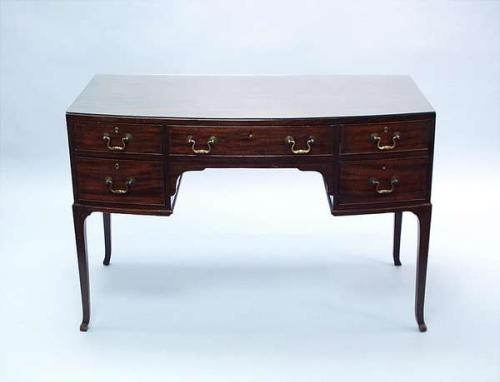 An English mahogany lady's desk by Maple Co. Front with five drawers. Raised on tapered legs. With fitted glass top. 46" wide, 22 1/2" deep, 31" high. With maker's mark. 1500-2500