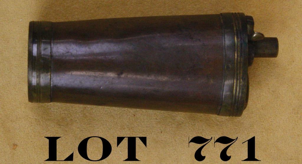 An English powder flask with compartment for .60 + caliber balls and screw off bottom for flints; good to very good condition, some small dents, 60%-70% lacquer, good spring. Est.: $250-$500.