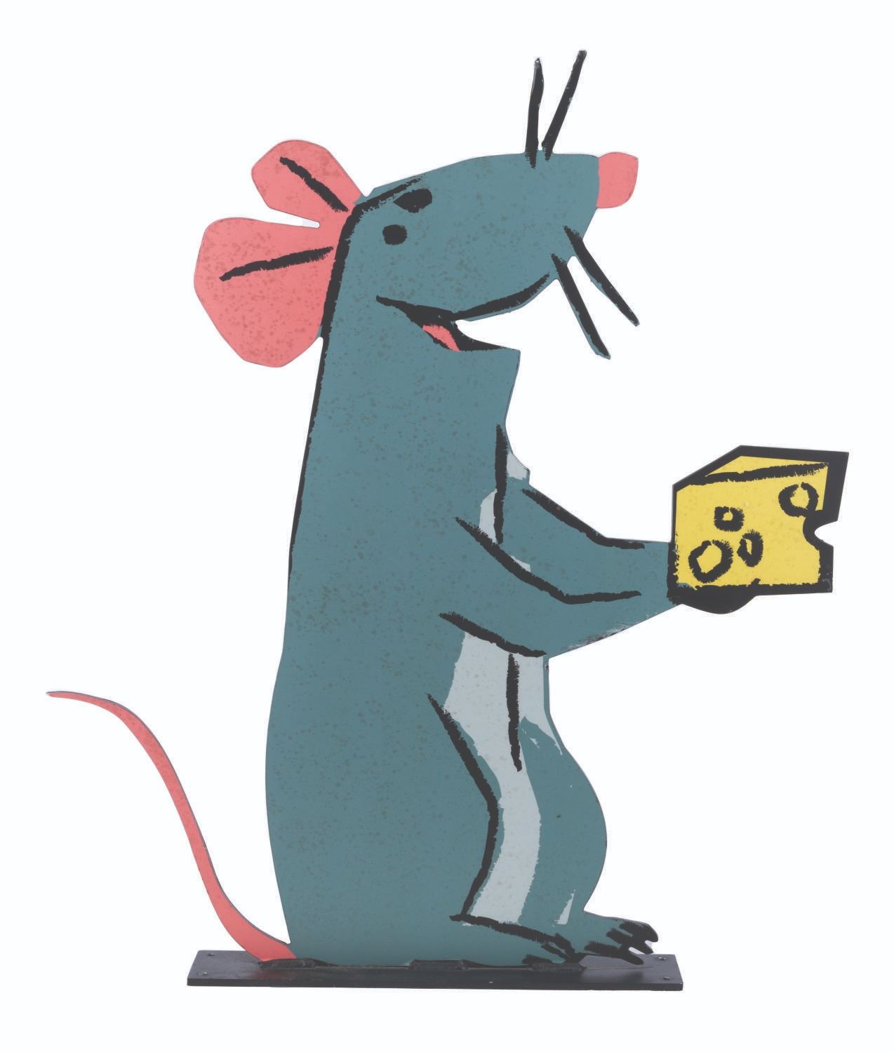 (Epcot, 2019) A double-sided Epcot International Food and Wine figure of Remy from "Ratatouille." Measuring 26.75” x 30” and .25" thick on a 16" x 3" base plate, the aluminum figure is in very good condition with minor peeling of the applique and laminate coating, scuffs and scratches, and wear from Park display.