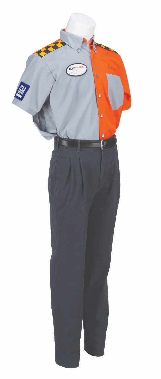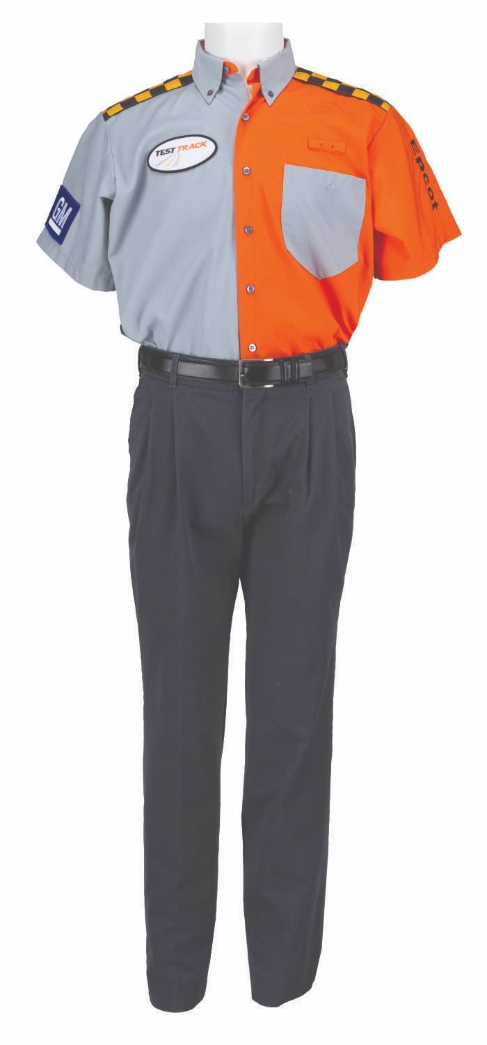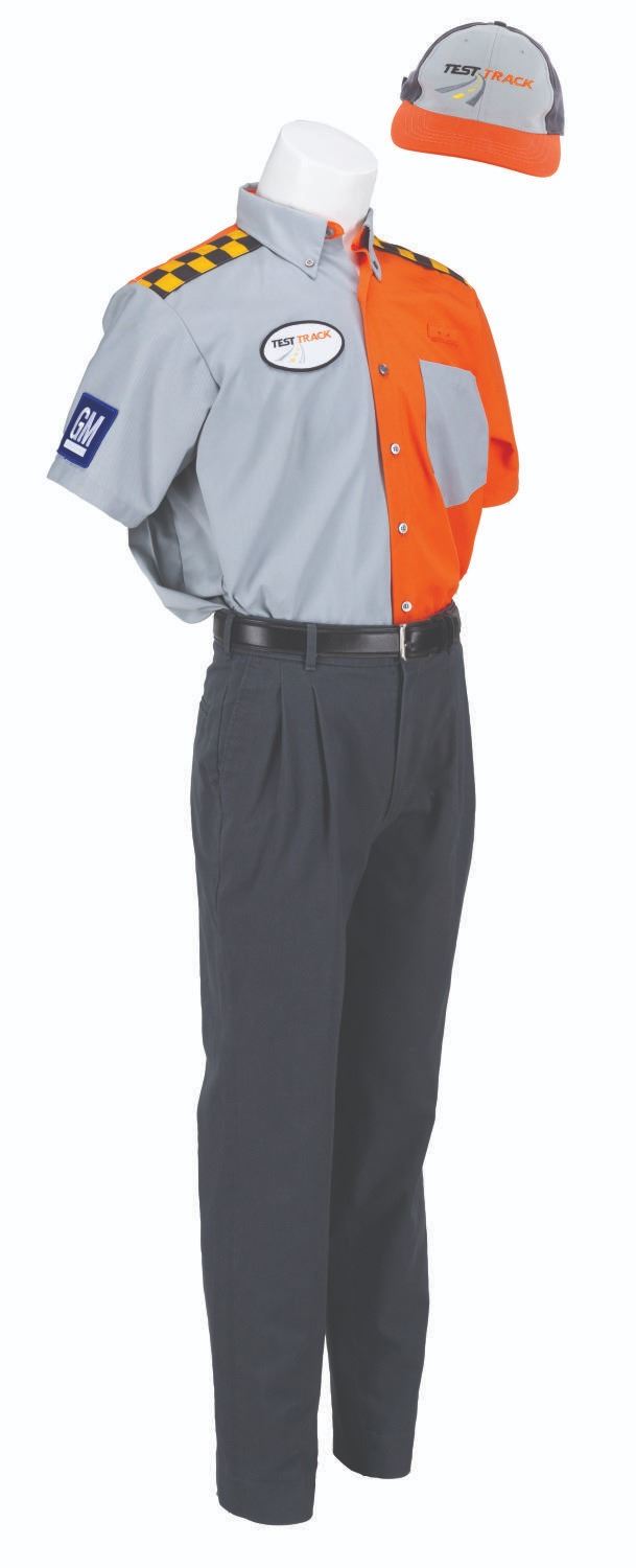 (Epcot, 1999-2012) A costume shirt, pair of pants, hat, and belt, worn by a Cast Member working at the Test Track attraction in Epcot. Each article, except the belt, retains the original Disney Wardrobe tag. Also included is an Imagineering exclusive adjustable hat given to the crew during the attraction’s preview in December of 1998. The shirt is labeled a size L, the pants are 32 x 34, the belt is 40/42, and the hat is one size fits all. The costume displays in very good, Park-used condition with light stains above the bottom button hole and left pocket of the shirt, light stains on the upper left front of the pants, and the belt has been cut down to 36" with a hand-punched hole.