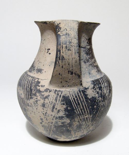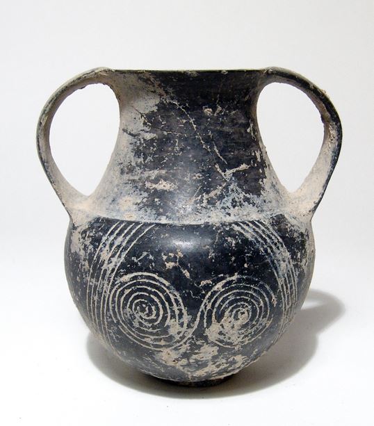 An Etruscan Bucchero amphora, Italic, c. 640 - 620 BC, the globular body with low disc base, concave neck, everted rim and flat arching handles. The decoration on the body consists of double spirals and multiple stroke 'W' beneath each of the handles. H: 4 2/5 in (11.3cm). Heavy mineral deposits inside and out, the disk foot with antique restoration. Cf. Perkins, Etruscan Bucchero in the British Museum, (London, 2007), p. 13, no. 7 for the type; Ex South German private collection of an artist and art collector, purchased between 1960 to 1980.
