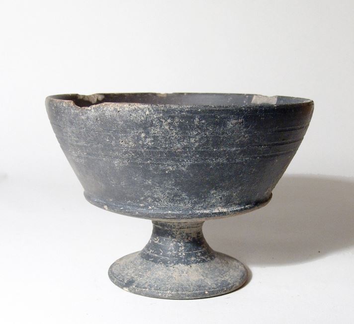 An Etruscan Bucchero chalice, Italic, c. 625 - 600 BC, with low pedestal foot, the bowl with angled sides and ridge near the base, three shallow grooves midway to the rim. Nicely burnished surfaces with medium grey color. H: 3 2/3 in (9.3cm). Few minor chips and mineral deposits. Cf. Perkins, Etruscan Bucchero in the British Museum, (London, 2007), p. 29, no. 84 for the type; Ex South German private collection of an artist and art collector, purchased between 1960 to 1980.