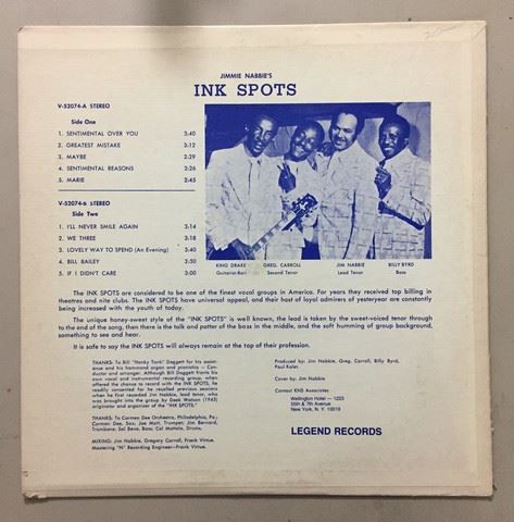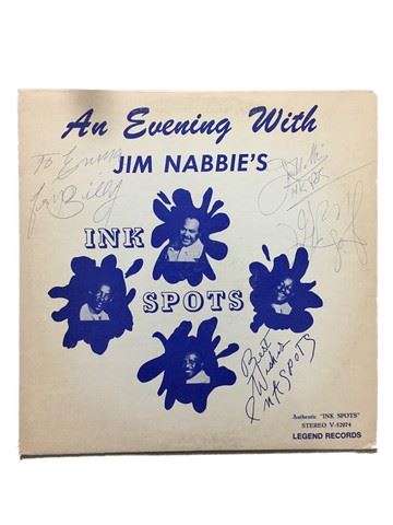 Autographed album cover of "An Evening with Jim Nabbie's Ink Spots", signed by Billy Byrd, the Bass of the group. The album cover includes a signature stating, "Best Wishes, Ink Spots" as part of the cover art. 10 songs total make up this album with 5 on each side of record.