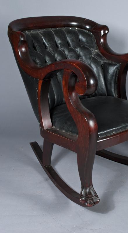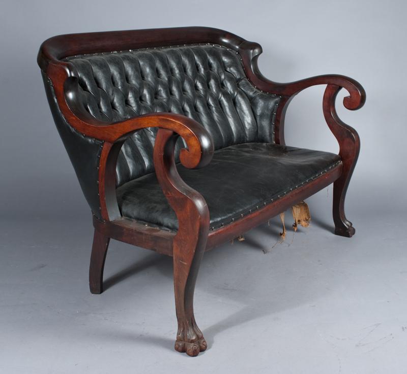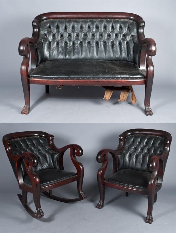To include a settee with tough leather back and leather seat, an armchair with tuft leather back and leather seat, and a rocking chair with tuft leather back and leather seat, all with claw feet, all pieces retain their original finish and original leather work. Settee measures 49.5"W X 37"H X 28"D, circa 1830's, condition very good to excellent on all pieces, Settee with loose burlap stripping on right side bottom extra burlap to go with lot.