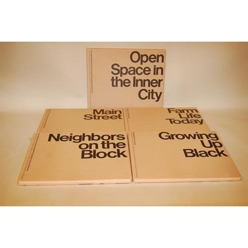An Exhibit Portfolio By the New York State Council on the Arts for the New York Museums Collaborative - 5 Volumes. 1971. Folio - over 12" - 15" tall. Hard Cover. Ex-Library. Very Good Condition. 5 (of 7 volumes in the series). Each volume has paper portfolio, containing full page, b/w photographic plates, on glossy hard stock, each in their own slipcase. ***Open Space in the Inner City, photographs by Arthur Tress, 50 plates. ***Growing Up Black, photographs by Leroy Lucas, 49 (of 50) plates. ***Neighbors on the Block, photographs by Laurence Salzmann, 50 plates. ***Farm Life Today, photographs by Joseph Consentino, 50 plates. ***Main Street, photographs by Milo Stewart, 50 plates. One slipcase has tape on the lower edge.