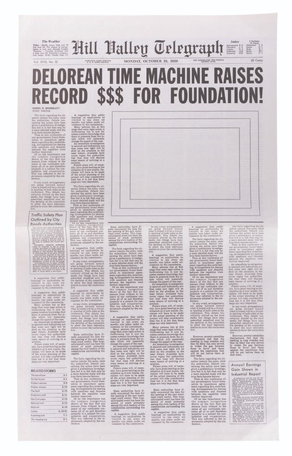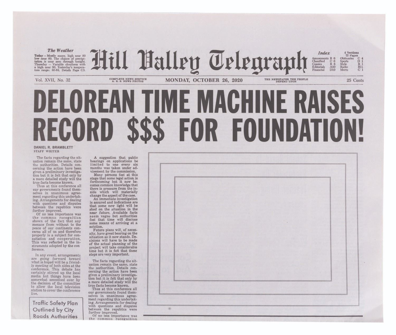 (Discovery Channel, 2021) A prop Hill Valley Telegraph newspaper from "Expedition: Back to the Future,” a mini-series in which Christopher Lloyd and Josh Gates traveled the country to find the original DeLorean time machine from "Back to the Future.” Measuring 23” x 13.75” when closed and 23” x 27.5 when open, the newspaper is in very good condition with light edge wear and creasing from production use.