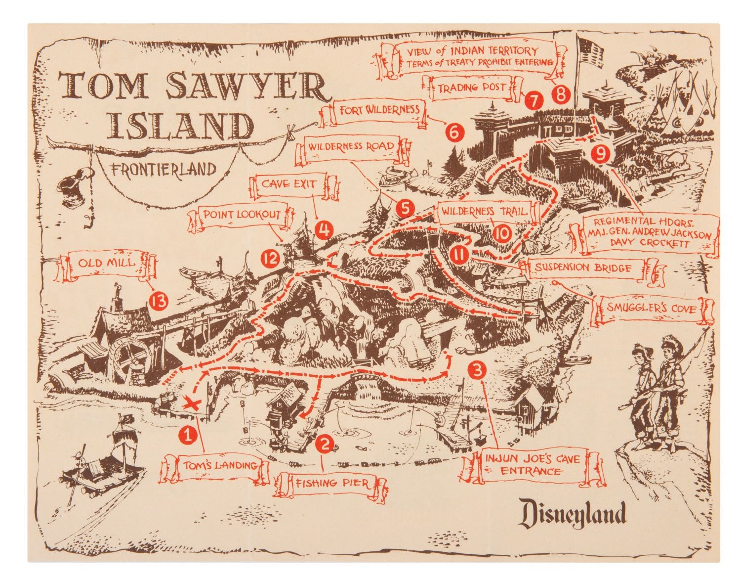 (Disneyland, 1956) A rare "Explorer's Map of Tom Sawyer Island" fold-out souvenir brochure from the early years of Frontierland. The brochure opens to reveal a stylish map on one side, with information on the opposite side featuring some of the highlights of the island. The Pirate's Lair did not appear on the map until 1957, although it opened in 1956. Measuring 11"x8.5" unfolded, the map is in very good condition with minor surface wear from use.
