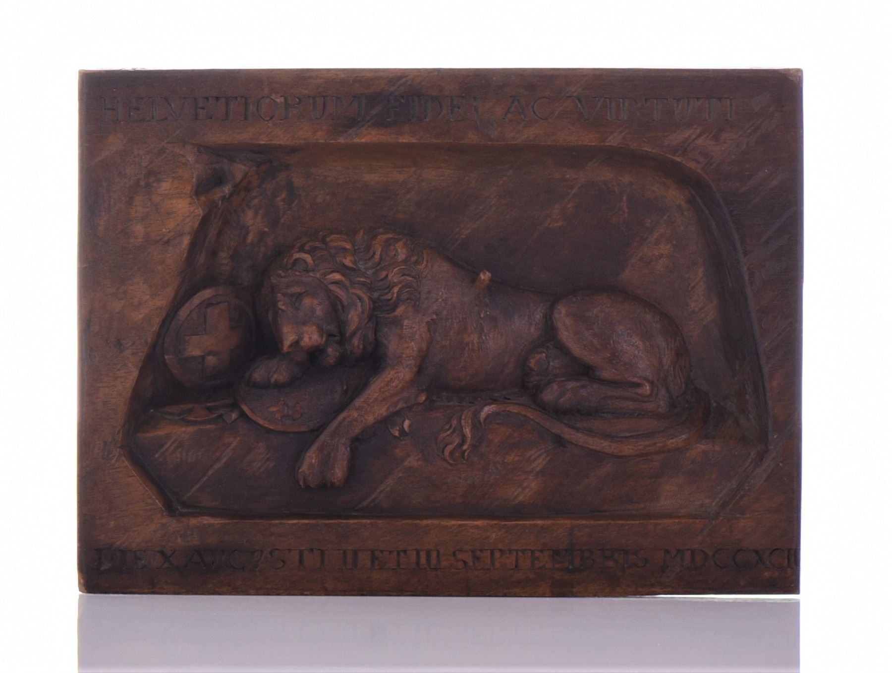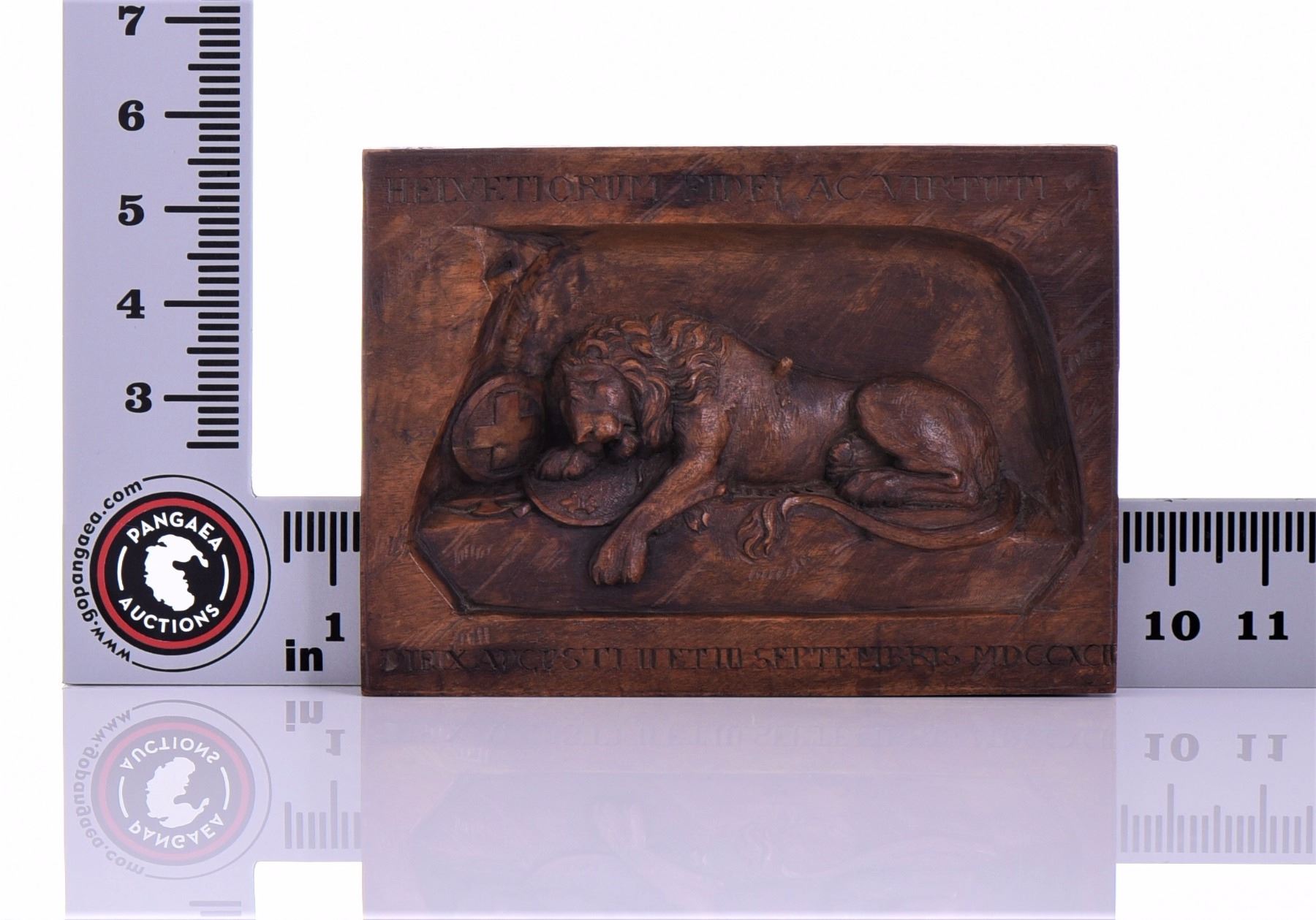 An Exquisite Carved Wood Plaque of the Lion of Lucerne, singed "K" and "909" on back. This carving is a model of the Lion of Lucerne depicted in a recumbent pose lying on a shield having a Latin inscription "HELVETICRUM FIDEL AC VIRTUTI" translated to "To the loyalty and bravery of the Swiss" and "DIE X AUGUSTI II ET II SEPTEMBRIS MDCCXCII" The background for this monument, one of Thorvaldsen’s most famous works internationally, is an historical event that took place during the French Revolution, when Thorvaldsen himself was still a young man living in Copenhagen. On August 10, 1792, the 1100 man strong Swiss Guard regiment protecting the Tuileries, a palace of King Louis XVI in Paris, was defeated when the palace was stormed by Revolutionary forces. In practice, the Swiss Guards were professional mercenaries, who in this case were in the employ of the French monarchy. The storming of the Tuileries led to a massacre of the guards, who ultimately surrendered their weapons, reportedly on the orders of the king. Of the Swiss Guards who survived the storming, many were killed soon afterwards, some directly by the mob; others were hauled before a military tribunal of the Legislative Assembly, and then hanged on September 2 and 3. All in all, approximately 650 Swiss Guards were killed during the Tuileries raid on August 10, and approximately 200 more were hanged subsequently. Only about a fifth of the regiment survived. Estimated more than 75 yrs. old. Size and/or Weight: See Measurement Photo. (Photos Represent The Lot Condition, Pangaea Auctions)