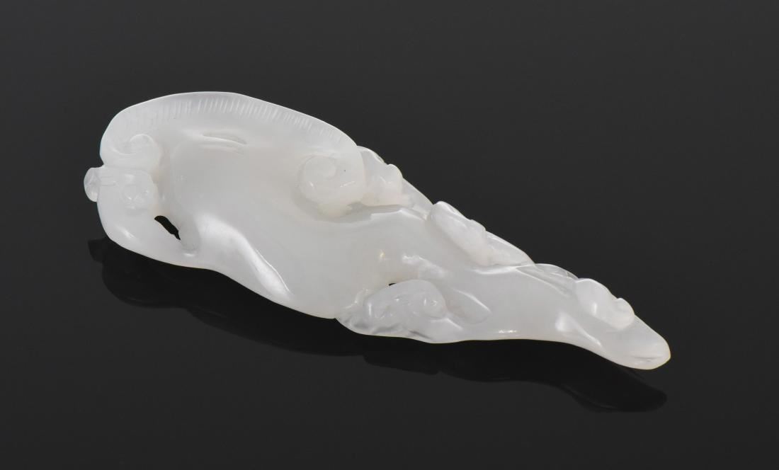 An Exquisite Chinese White Jade Toggle Carving With Snow White Color And Glass Transparency, Qing Dynasty. Estimated more than 200 yrs old. Jadeite is called Yingyu in Chinese, with a Mohs hardness of 7; its pressure bearing capacity is must greater than the diamond, belonging to the category of pyroxene. Jadeite integrates the beauty of jade and brilliance of a gem. Its colors are very mysterious and enigmatic, elegant, pure and soft. Jadeite is bright in color, with a glass gloss oily appearance and a high transparency in upwards of 3mm to 5mm light penetration. It is hard enough to cut glass and is cold to the touch. There are multiple grades of Jadeite. 1. Glass Jadeite; the best jade species, featured by the highest transparency, almost entirely transparent. It contains fewer inclusions comprised of impurities and is crystal clear. 2. White Jadeite; fine in texture with common transparency and white as snow. Often with a fibrous structure most of which is opaque with maximum light penetration up to 1mm depth. Typically used for bracelets, carvings and pendants. 3. Flower Green Jadeite; is in vein distribution, grounding by light green and other colors, in coarse and refined texture. It is a more widely distributed species and is classified according to the color distribution status varying from sparse and intensive and the color ranging from dark to light. 4. Oily Green Jadeite; refers to the dark emerald green with it color not pure green, but with gray and a tone of blue varying from light to dark. Good transparency and the surface has an oily sheen due to different degrees of green shades. It is referred to as "Rind Oily Green" in dark color and "Fresh Oily Green" in light color. Size: See Ruler Photo. (Photos Represent The Condition Of The Lot.)