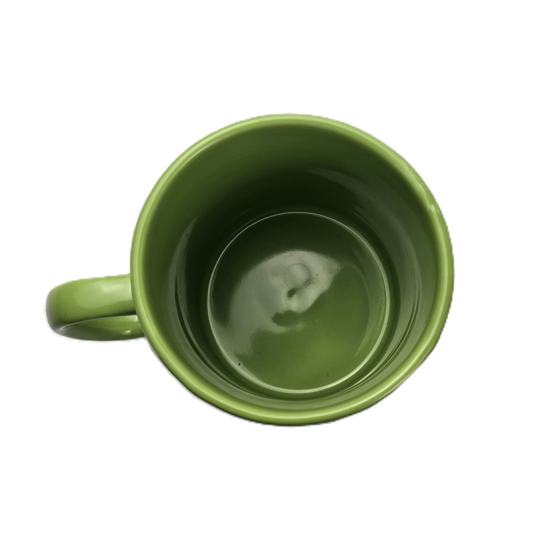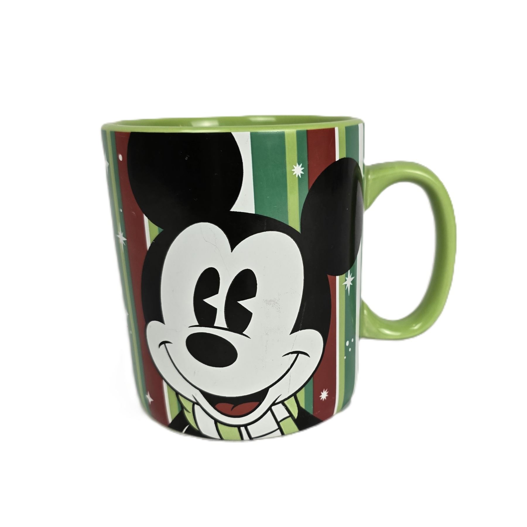 (Disney) This is an extra large green holiday mug featuring a large Mickey Face wearing a scarf. Snowflakes and stars are patterned across the vertically stripped exterior. It is is excellent condition. It measures 6.5" in diameter and 5" tall. It weighs 1lb 15 oz.