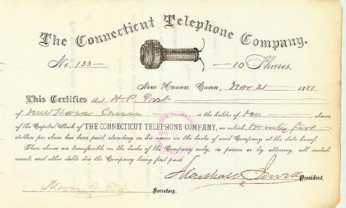 MARSHALL JEWELL. 1881, Connecticut. Stock certificate of the Connecticut Telephone Company for 10 shares boldly signed "Marshall Jewell" as president. Black on white paper with a small vignette of an early telephone receiver at the top. Litho. The world's first commercial telephone exchange was established in New Haven just two years after the invention of the telephone and three years before this stock was issued. Thus, this is one of the earliest known telephone stocks in existence. It is lightly stamp cancelled though not affecting the signature. There is very light toning to the extreme right edge and it is in very fine condition.