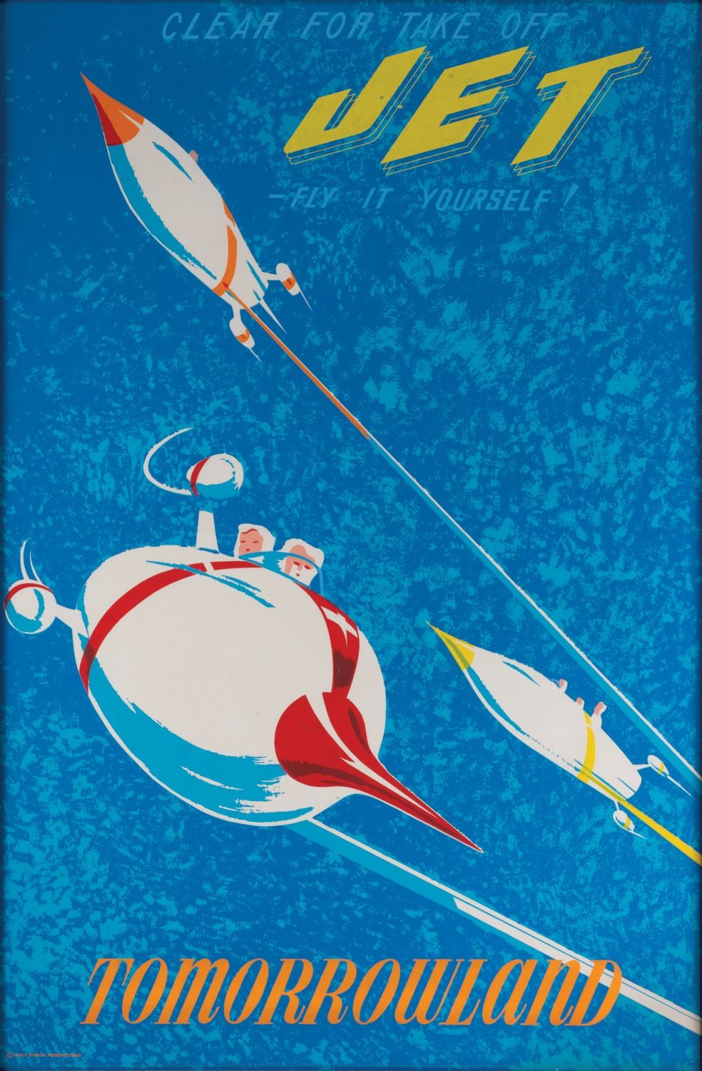 (Disneyland, 1961) A very rare original hand-silkscreened attraction poster for the Astrojets in Tomorrowland, designed by Bjorn Aronson. When American Airlines produced an "Astrojet" airliner in 1961, Disney removed the name from the attraction, and silk-screened "JET" on the original poster. The letters of "Astro-jet" can be seen faintly through the yellow lettering. This 36"x54" poster is in fine condition, linen backed for preservation, with few mild creases throughout, and a single horizontal center crease line.