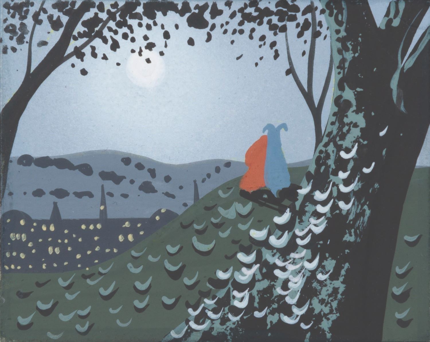 (Disney, 1955) An Eyvind Earle thumbnail color study for the Bella Notte sequence in “Lady and the Tramp.” Serving as both a background artist and color stylist on the animated film, Earle's unique style helped establish “Lady and the Tramp” as one of the great Disney animated films of Walt's era. This tiny painting evokes both the mood and appearance intended for this pivotal scene. Accomplished in gouache on art board, the painting is signed by Earle on the back. The painting measures 2" x 2.5" and is in fine condition.
