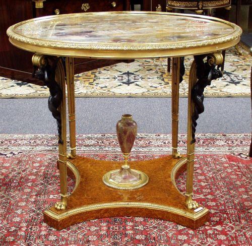 An F. LINKE design antique French gilt bronze and mahogany centre table. With coloured marble top, scroll legs with applied bronze winged nereids and an urn centered on the plinth base. Illustrated in C. Payne: "19th Century European Furniture", page 222.