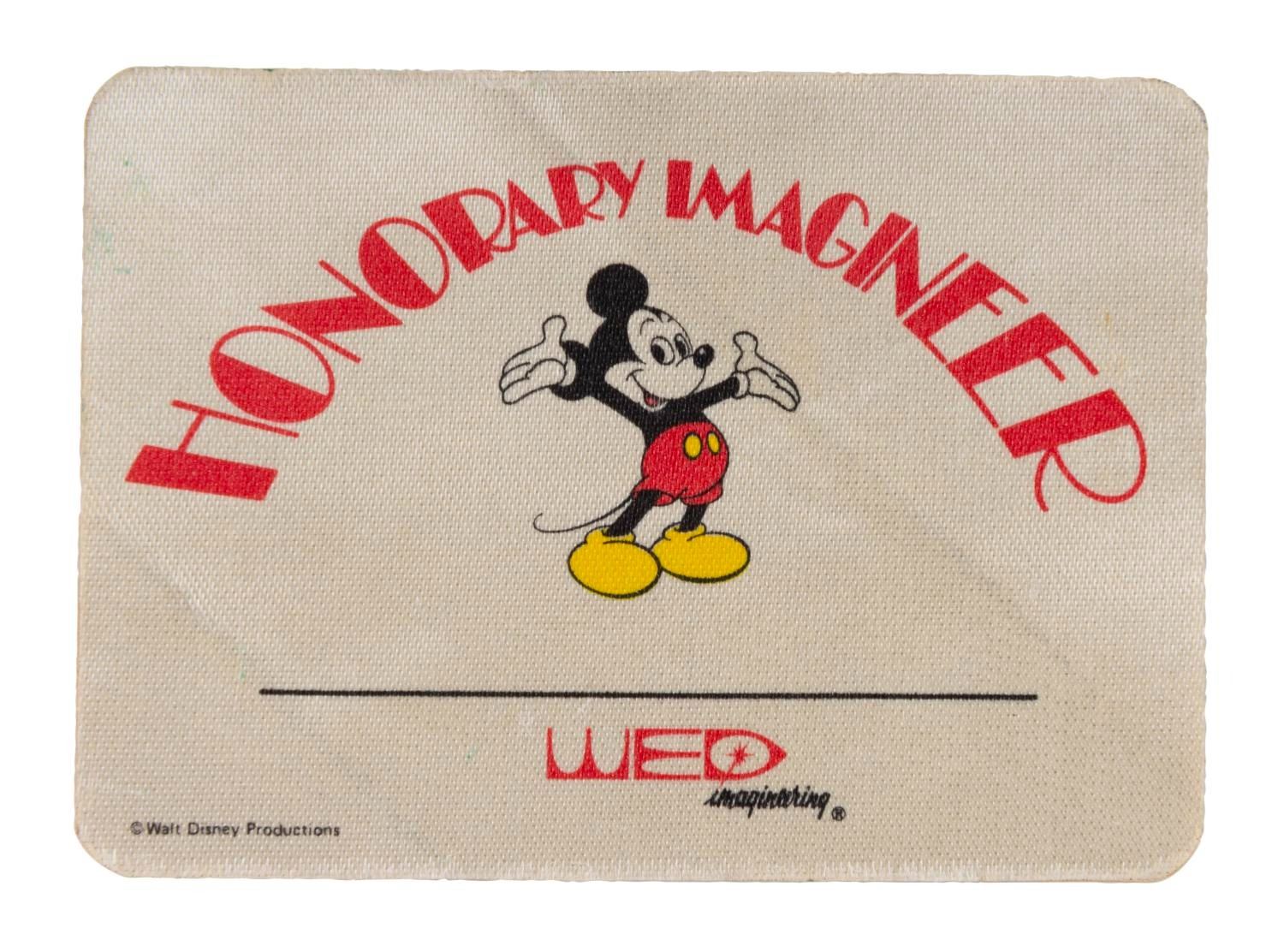 (Imagineering, 1980s) A WED-era Honorary Imagineer temporary badge label given to Guests of WED Imagineering-sponsored events. Measuring 2.5" x 3.5", the adhesive sticker is in very good condition with slight yellowing, having never been used, and retaining its backing.
