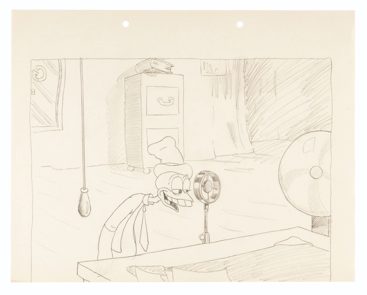 (Schlesinger, 1936) An original layout drawing of Simple Simon from the Merrie Melodies short “I Love to Singa.” Measuring 9.5” x 12” with a character image size of 8” x 10.5”, the graphite drawing is in very good production-used condition with light edge wear and discoloration from age.