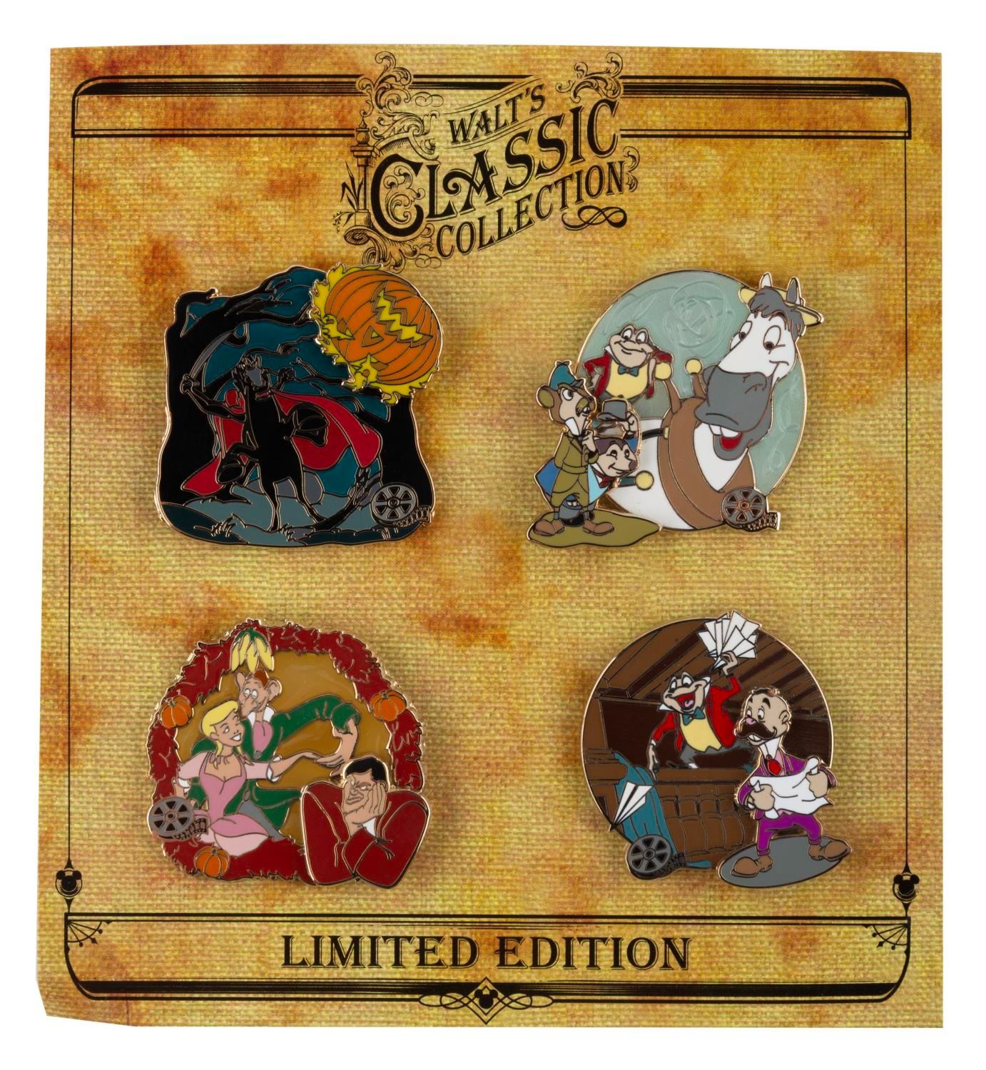 (Disney Parks, 2010) A set of four"The Adventures of Ichabod and Mr. Toad" pins. Limited to an edition of 2000, this set was the August release in the monthly"Walt's Classic Collection" series. Measuring 1.5" x 1.75" each on the original 5.5" x 6" card, the pins are in fine condition, with wear including creases and scratches to the card.