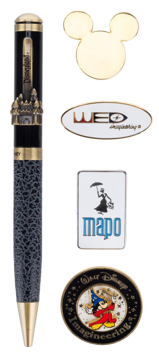 (Walt Disney Imagineering, 1986-90s) A collection of Imagineering pins and a Disneyland pen. The set features a history of the name changes to Imagineering through the years, with pins of the original WED, MAPO, and Walt Disney Imagineering logos. Included is a large gold Mickey tie tack dated 1986, and a Disneyland pen with the castle on the clip. The pieces are in fine condition, with the tie tack in good condition with small spots of wear from use.