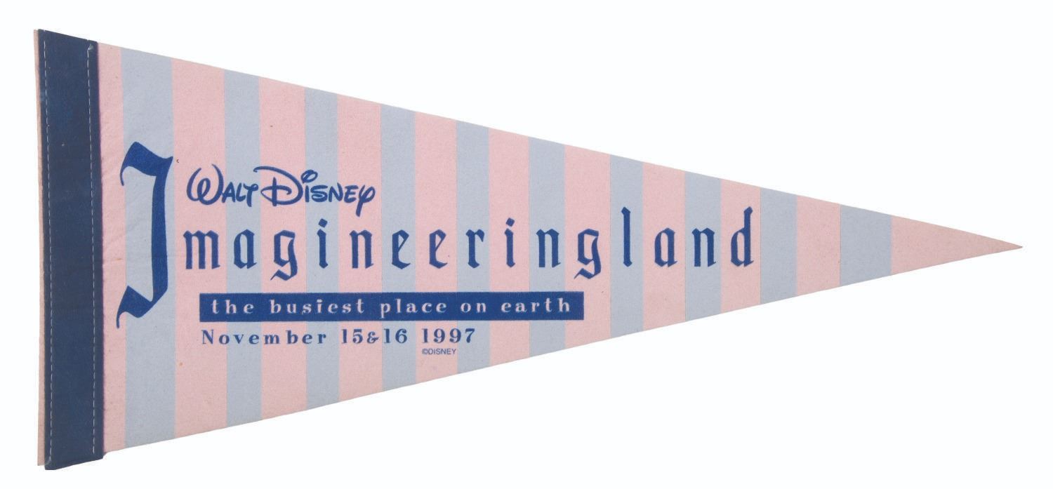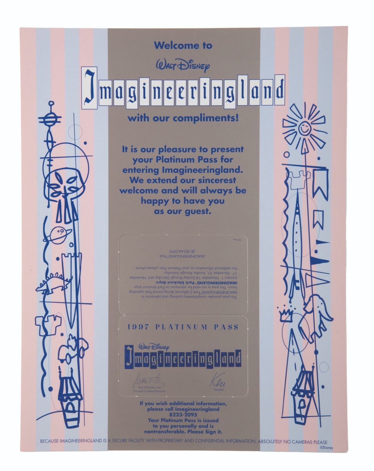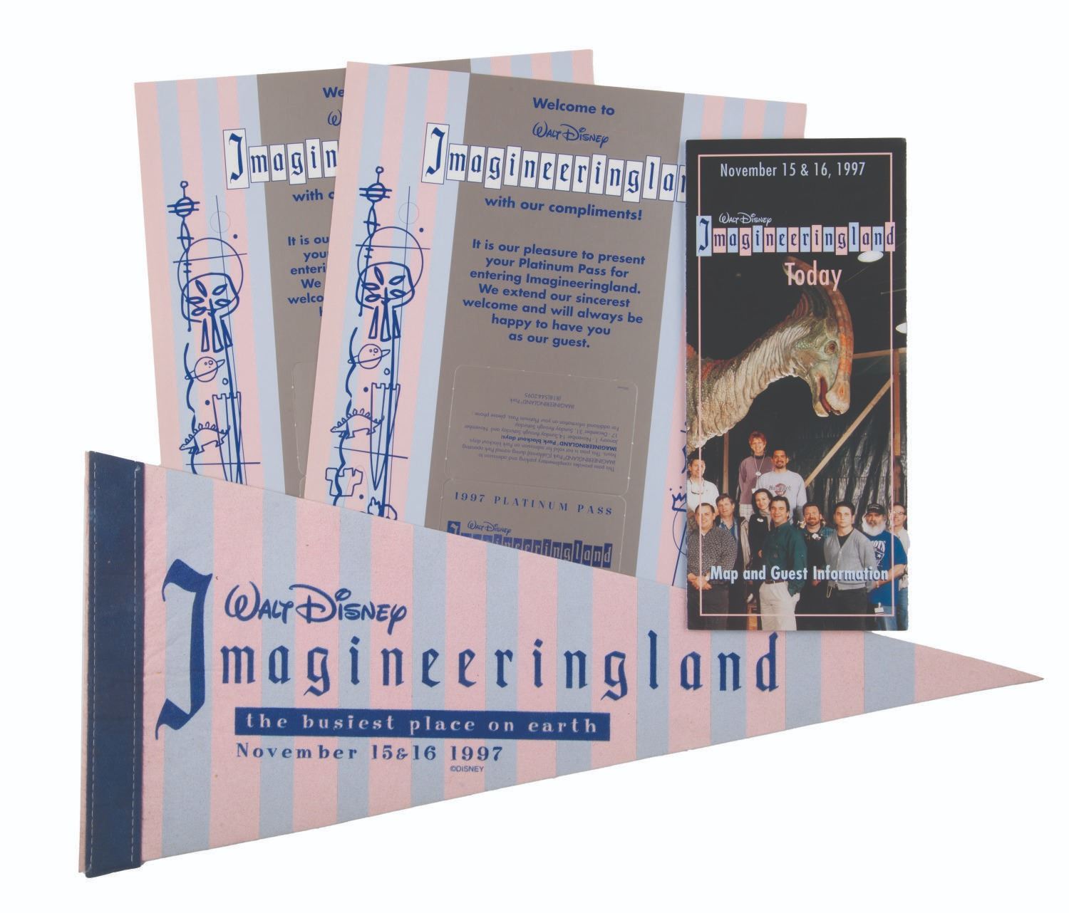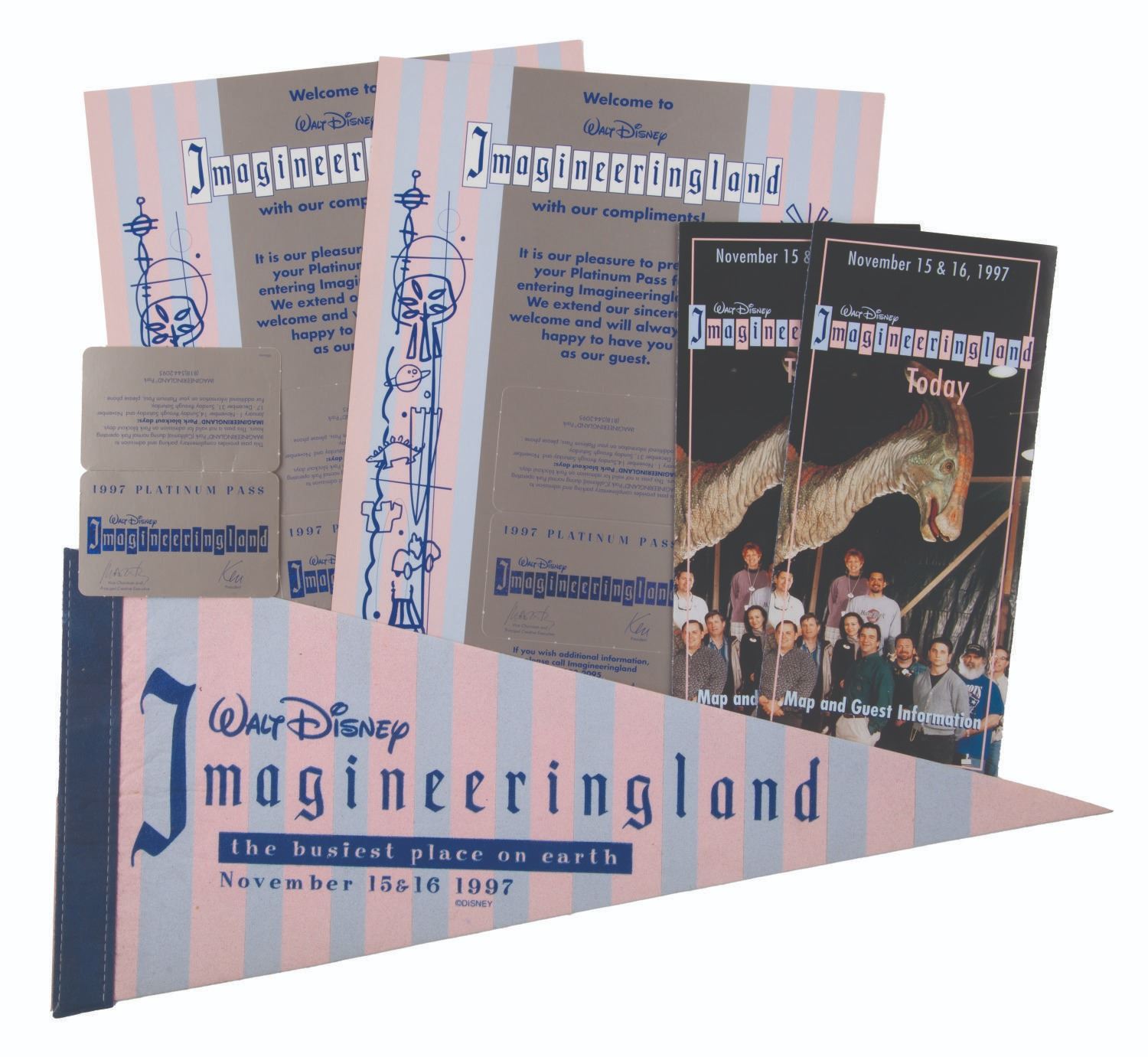 (WDI, 1997) A collection of souvenirs from Imagineeringland, a Walt Disney Imagineering Open House event on November 15 & 16, 1997. The collection includes a pennant, two unpunched Platinum Pass access cards, one used Platinum Pass, and two Map and Guest Information brochures patterned on Disneyland guide maps. Measuring up to the 8” x 17.5” pennant, the souvenirs are in good to very good condition, with handling wear to the used pass.