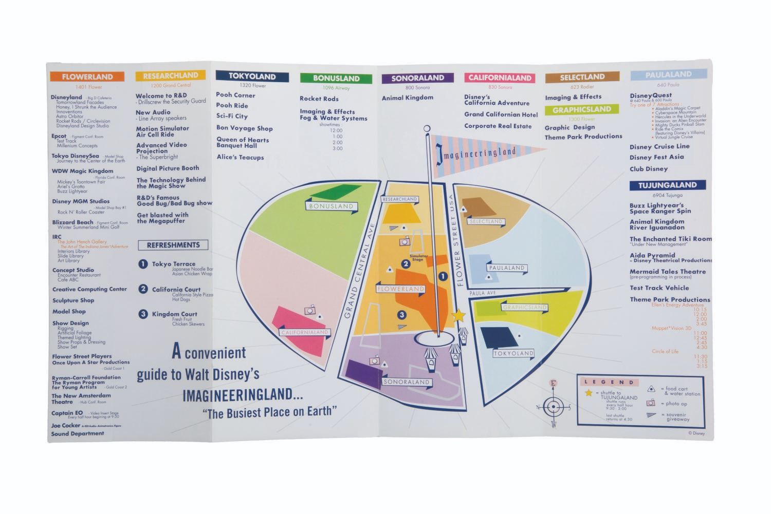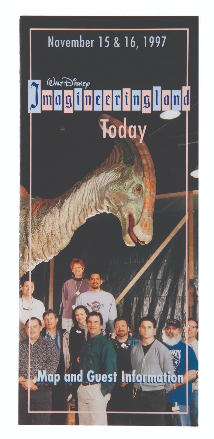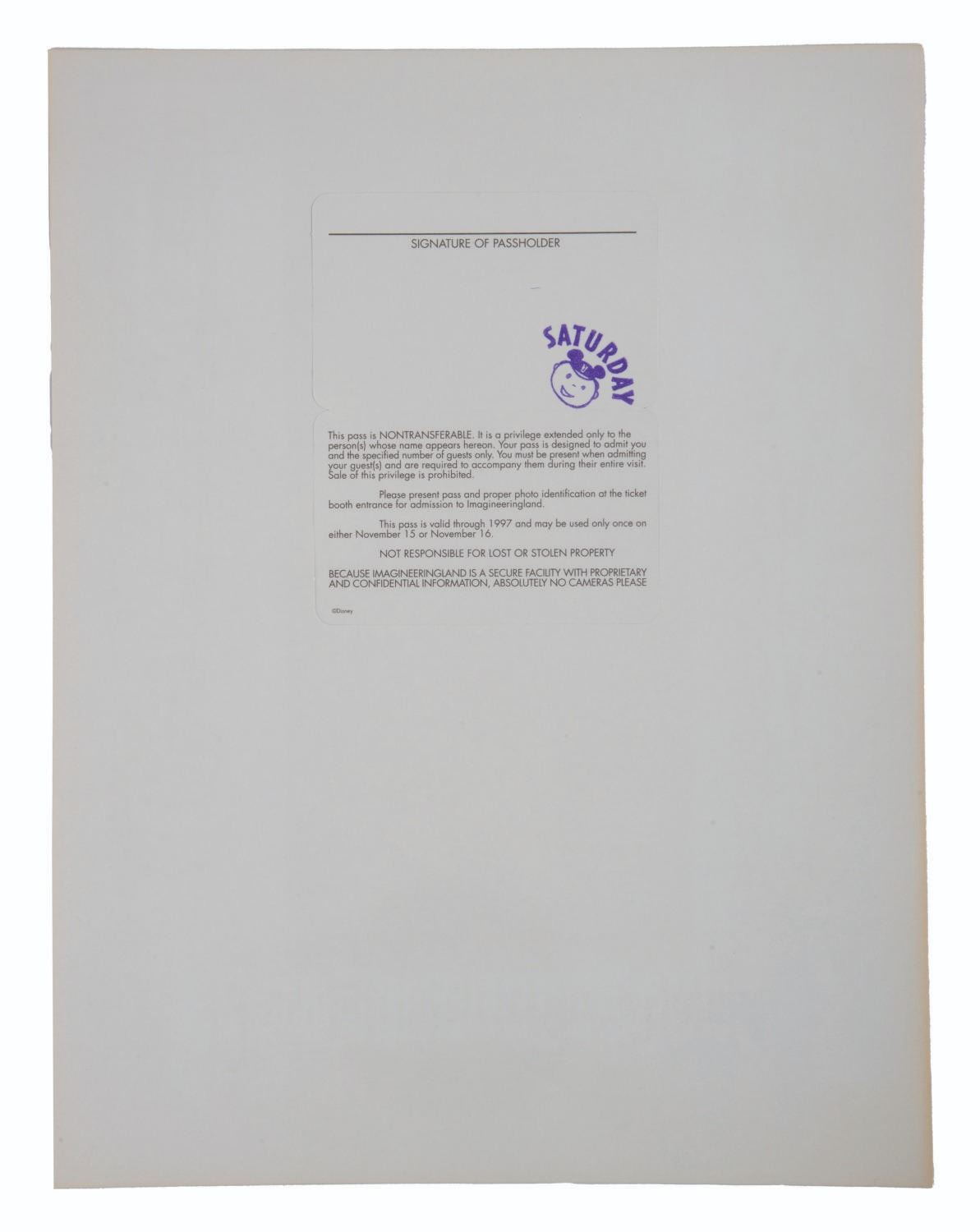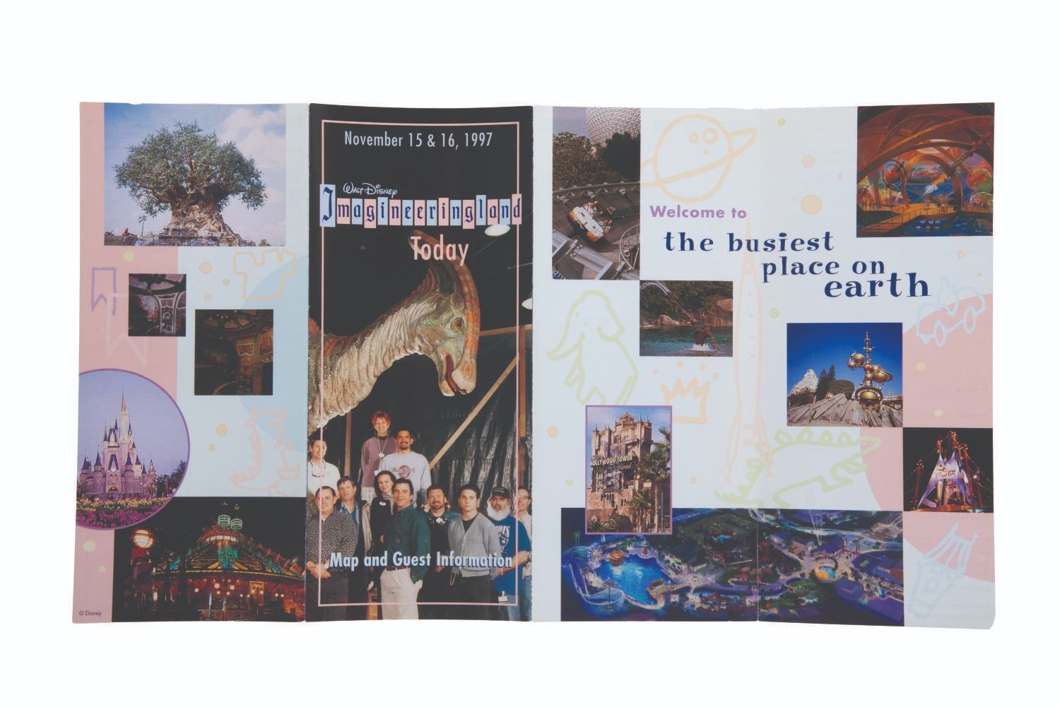 (WDI, 1997) A collection of souvenirs from Imagineeringland, a Walt Disney Imagineering Open House event on November 15 & 16, 1997. The collection includes a pennant, two unpunched Platinum Pass access cards, one used Platinum Pass, and two Map and Guest Information brochures patterned on Disneyland guide maps. Measuring up to the 8” x 17.5” pennant, the souvenirs are in good to very good condition, with handling wear to the used pass.
