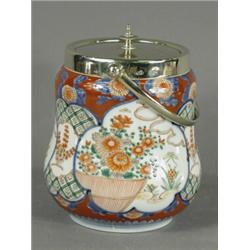 An Imari biscuit barrel with plated lid stamped Mappin Brothers Est. 100/200