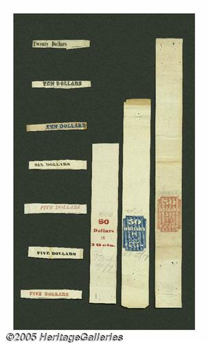 <B>An Incredible Collection of Fractional Currency Treasury Bands.</B></I> Tom has acquired a group of ten different bands, several of which we have never seen before, including three larger bands apparently intended to hold multiple bundles. The largest was intended for $50 in 10¢ notes. We've seen individual ordinary bands sell in the $25 range and suspect that this irreplaceable group of ten should be worth at least...