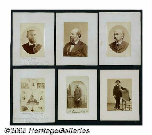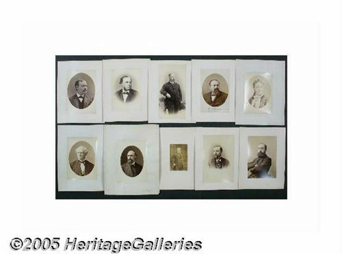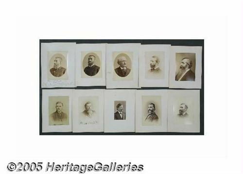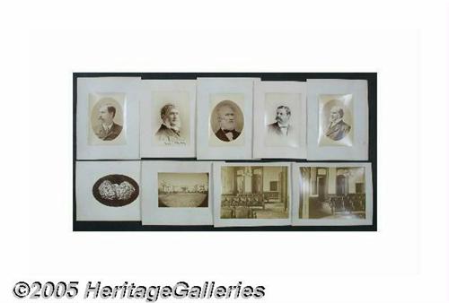 <B>An Incredible Photographic Archive Documenting the Trial of James Garfield's Assassin, Charles Guiteau</B></I> Accused of a capital crime, a man sits in his cell signing autographs and inscribing photos for sale to those obsessed with his murder trial. O. J. Simpson a few years back? No. Charles Guiteau, presidential assassin, more than a century ago. There is nothing new in the marketing of one's likeness while incarcerated. While unique in degree (O. J. is purported to have made hundreds of thousands of dollars signing cards, footballs, etc. while in the Los Angeles jail), the practice dates back to the advent of popular photography. Perhaps the first to utilize this approach for funding a legal defense was Charles Julius Guiteau. <B>This lot is the definitive photographic archive that documents the events detailed below.</B></I> Guiteau was born in Freeport, Illinois, September 8, 1841. In the forty-one years he lived, his only "accomplishment" was the assassination of President James A. Garfield. A failed New York attorney whose area of specialization was small claims - for which he charged an astounding 75% contingency fee - the man was always of "questionable sanity." After Garfield won the 1880 election, Guiteau concocted the perfect job for himself. He wanted to work in the U.S. Consulate Office in Paris. Believing he had much more intelligence and ability than anyone with such aspirations, Guiteau thought he could just name a job and it would be his. He constantly visited the White House to talk with the President's staff. In a short while, the secretaries were no longer amused by his "drop ins." By the spring of 1881, the White House was off limits to this unsuccessful office-seeker. Guiteau became enraged. On July 2, 1881, the President prepared to leave Washington on a two-week holiday. He entered the Baltimore and Potomac Railway Depot in only the company of Secretary of State James G. Blaine. Given the lack of security, it was a simple matter for Guiteau to walk right up to the President and fire two shots from a 44-calibre revolver. The first ball passed through Garfield's left shoulder, the second lodged in his back above the left kidney. He survived for eighty days, eventually dying of blood poisoning. Ironically, Garfield had personal insight into the horror of a presidential assassination. A hero of the Civil War, Congressman Garfield found himself in New York City when news broke of the assassination of President Lincoln. A mob of more than 50,000 massed at the Custom's House in downtown Manhattan and threatened to riot. When they began marching to the office of the <I>New York World</B></I> (a newspaper ever-critical of Lincoln) crying, "Vengeance!" Garfield single-handedly stopped the crowd by delivering a moving speech that called for calm. <I>"The President's tragic death was a sad necessity,"</B></I> is a quote from a letter found in the pocket of the assassin. <I>"In the President's madness he has wrecked the once grand old Republican party; and for this he dies."</B></I> (He would also blame James G. Blaine as inspiring his evil deed.) He fled the shooting scene in a cab, but turned himself in a few hours later. In his cell Guiteau wrote his own epitaph: <I>"Here lies the body of Charles Guiteau, Patriot and Christian."</B></I> Guiteau went to trial on November 14, 1881. The verdict was rendered January 25, 1882, and he was hanged at the jail in Washington, D.C. five months later. At no time during his incarceration did Guiteau slow his efforts to find public support for his actions. And just as much energy went into selling photographs taken from his jail cell. As he wrote in one note on February 8, 1882, <I>"Dear Sir: Photographs are one dollar apiece or $9 per dozen... The photograph is very fine. Send for what you wish by money order..."</B></I> While Guiteau himself may not have made very much, others did. As proclaimed in an advertisement for carte and cabinet photographs, selling these keepsakes from the trial represented <I>"A Fortune For Agents."</B></I> Images of the assassin, the trial judge, the lawyers, even montages of the president's family sold well. As the carte notes, <I>"These National portraits sell like hot cakes to every person who sees them at 50 cents each. Agents can make $10 a day in selling them."</B></I> Few extant examples of Guiteau images are known today. He seems to have passed into total obscurity with his jailhouse photographs long discarded. (The large number of John Wilkes Booth photographs still found are a function of the actor's own ego - Booth was considered quite handsome and loved to be photographed - and the fact that they were collected before April 15, 1865. But he stands alone in surviving the test of time.) We believe this incredible holding originates from the personal files/studio of Washington, D.C. photographer C. M. Bell. It is certainly the most comprehensive such collection known. C. M. Bell was the only photographer authorized by the defendant (and Washington authorities) to visit the Washington, D.C. jail to take portraits prior to the trial. In fact Guiteau seems to have entered into a partnership with the photographer as the assassin actively marketed these photographs to raise funds for his defense. This archive includes forty-six (46) original photographs. Forty-five are approximately 4" x 5.75" albumens mounted onto original 7" x 9" boards and in extremely fine condition. (One is a loose albumen with tear but still fine.) Several have the addition of period manuscript titling at the bottom of the mount with C. M. Bell's copyright notice. We believe these to have been the original plates by which maquettes were made or photographs were offered, as several include the partial autographs of those who posed. This voluminous archive includes: four (4) from-life portraits of Guiteau; three chest-up studies and one full standing shot. Two are hand titled with the addition of Bell's copyright notice. Two s