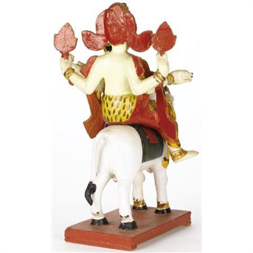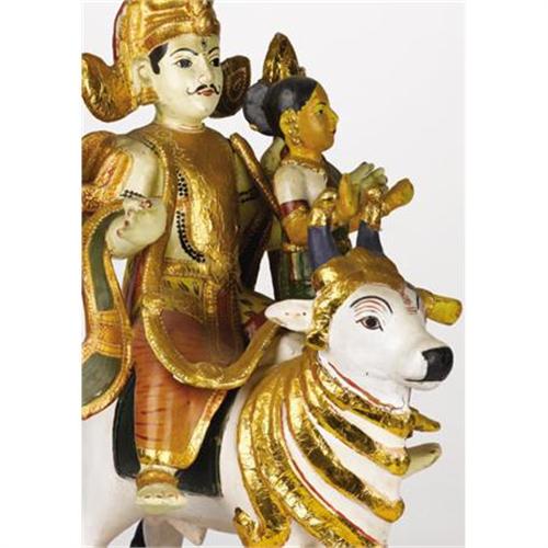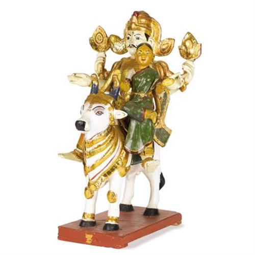 <B>An Indian Carved Wooden Sculpture<BR></B></I>Unknown maker<BR>Circa 1900<BR>The papier-mache sculpture of an Indian Deity with four arms and his consort riding on a cow, painted in bright colours with gold foil highlights, all on a painted wooden base<BR>Unmarked<BR>21.5 inches high x 15 inches wide x 12 inches deep<BR><BR><b>Shipping:</b> Requires 3rd Party Shipping (<a target="_blank" href="http://www.heritageauctions.com/common/shipping.php">view shipping information</a>)