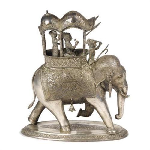 <B>An Indian Silverplate Elephant</B></I><BR>Unknown maker<BR>Nineteenth Century<BR>The elephant wearing an elaborate blanket and trappings with a Howdah on its back, two figures inside and a Mahout in front<BR>10.2 inches high<BR><BR><b>Shipping:</b> Requires 3rd Party Shipping (<a target="_blank" href="http://www.heritageauctions.com/common/shipping.php">view shipping information</a>)