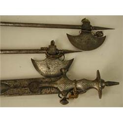 An Indian steel sword and two axes with decorated heads Est.50/100